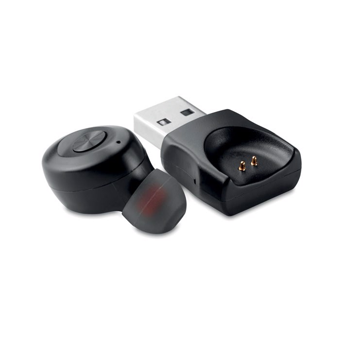 Single 5.0 wireless earbud built in microphone. Rechargeable Li-ion 50 mAh battery. Playing time approx. 4 hours. Presented in in PU/EVA pouch.