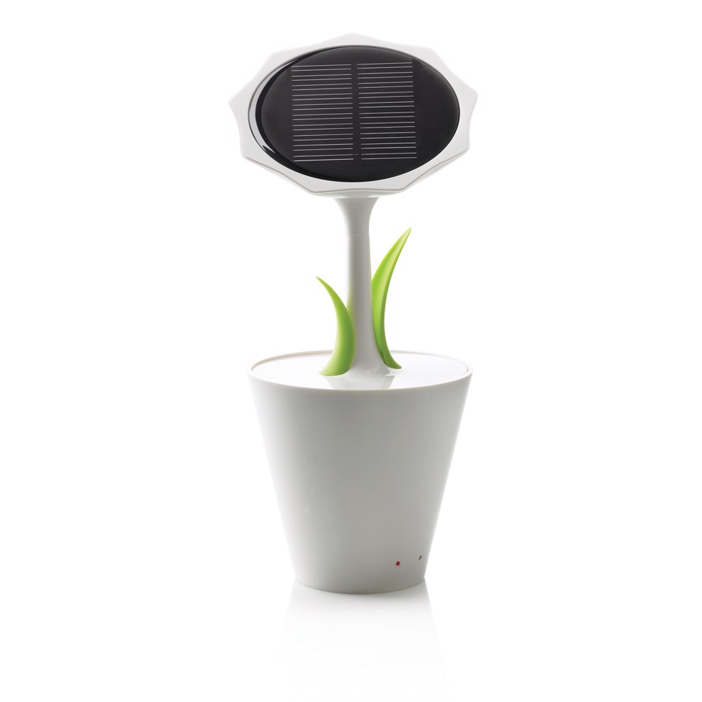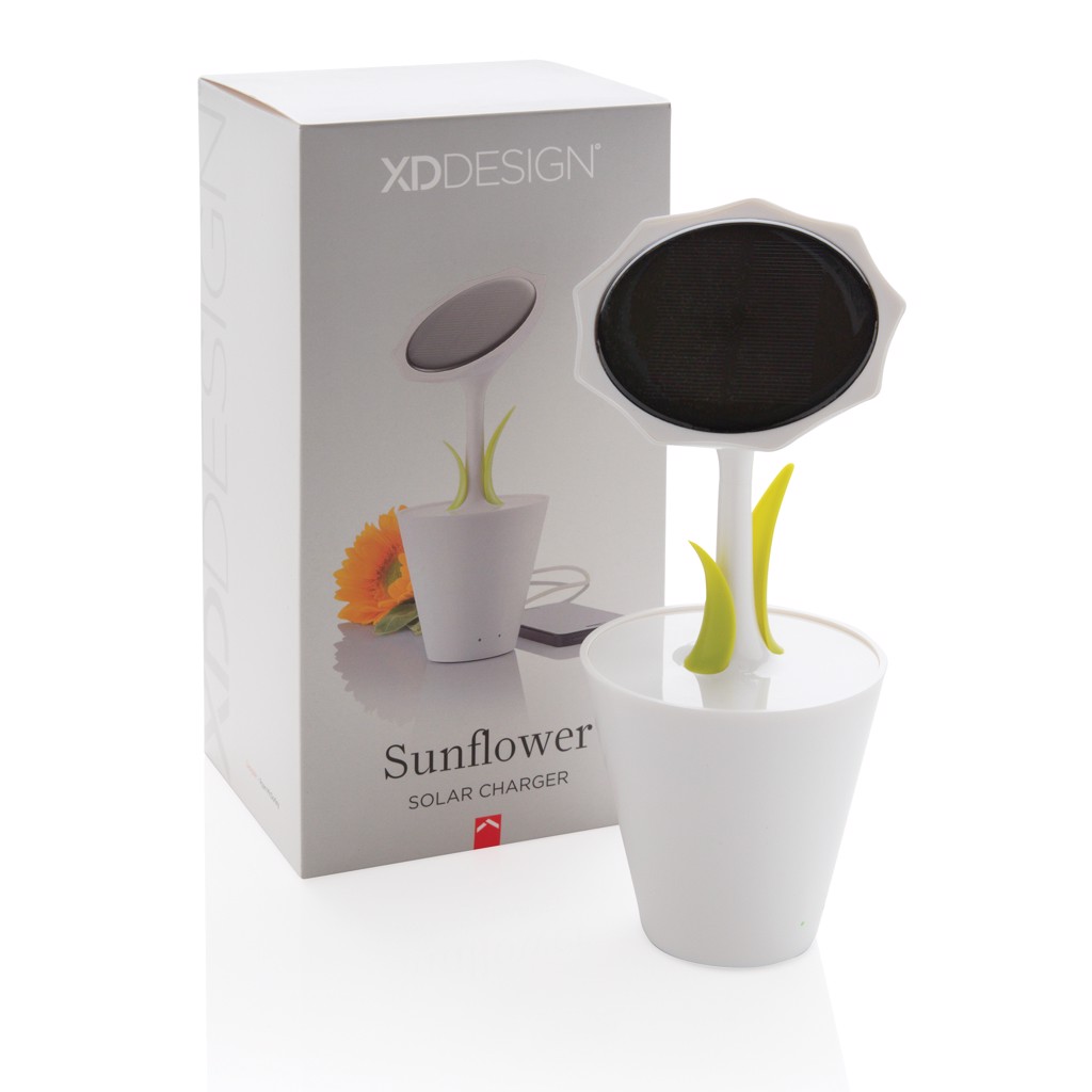 Sunflower brings solar energy to your desk with a smile! The 2500mAh rechargeable lithium battery inside is powerful enough to easily charge your mobile phone or MP3 player. The solar charger has a USB output and mini-USB input. Including mini USB cable. Registered design®