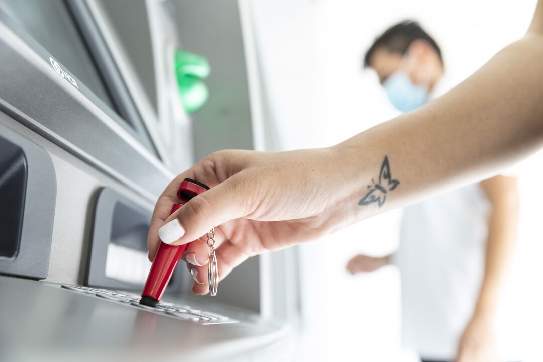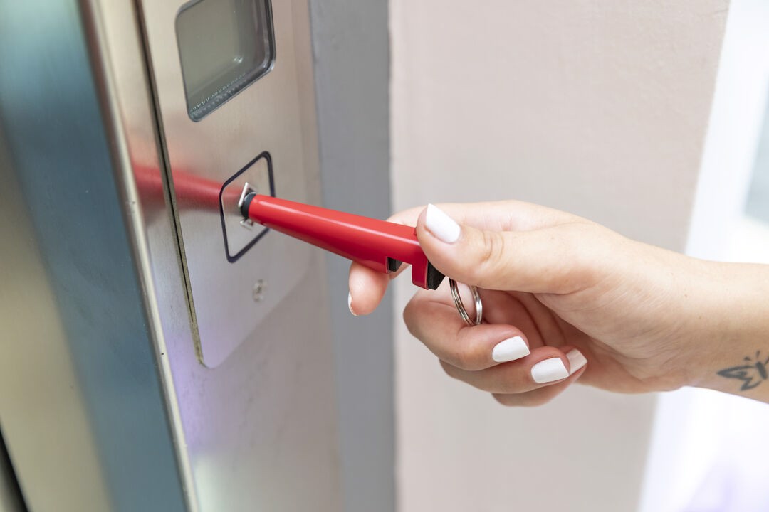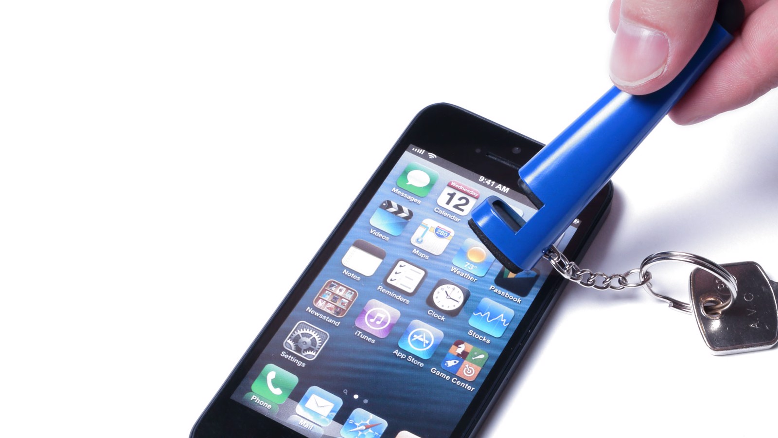Multifunction keyring with built-in smartphone holder and pointer. Body in soft glossy finish and bright tones. Screen Cleaner Included