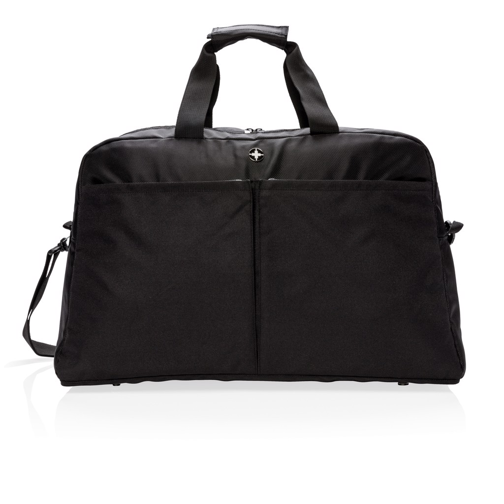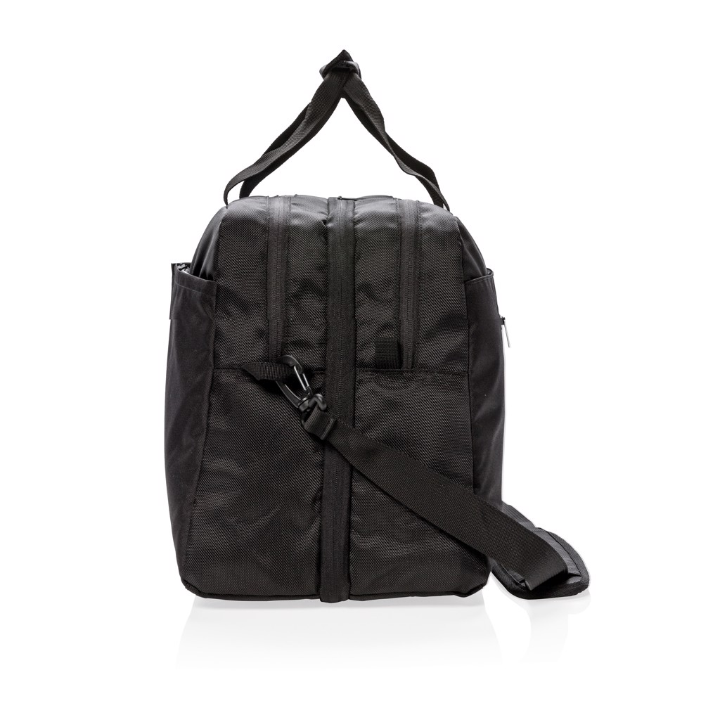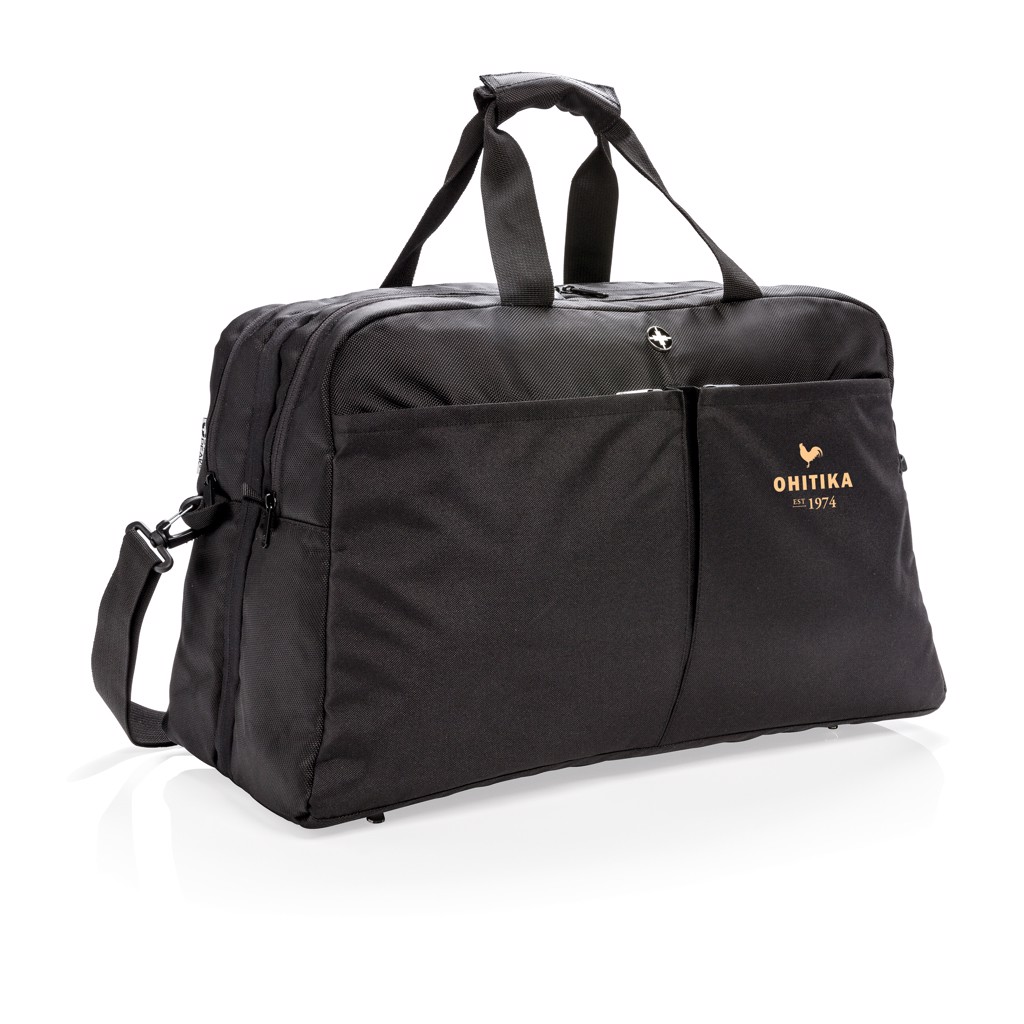 This groundbreaking hybrid design combines the best of both worlds. It contains the portability of a duffle with the organisation and opening of a suitcase. Zip around opening with access to dual compartments. Including one 15.6" laptop compartment. On the back is a magazine sleeve pocket and easy access zippered pocket with RFID protection. The front has 2 large zippered pockets with easy access. PVC Free. NFC (13.56 MHz) Blocking.