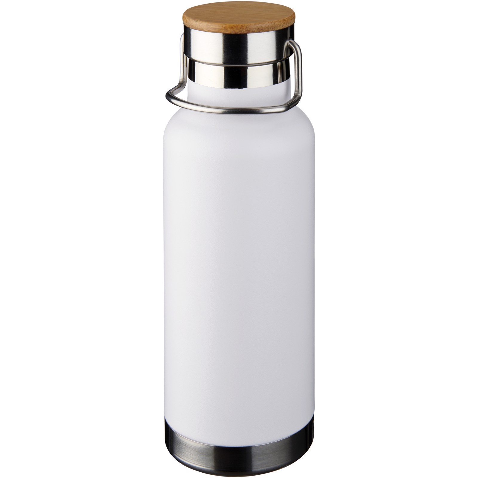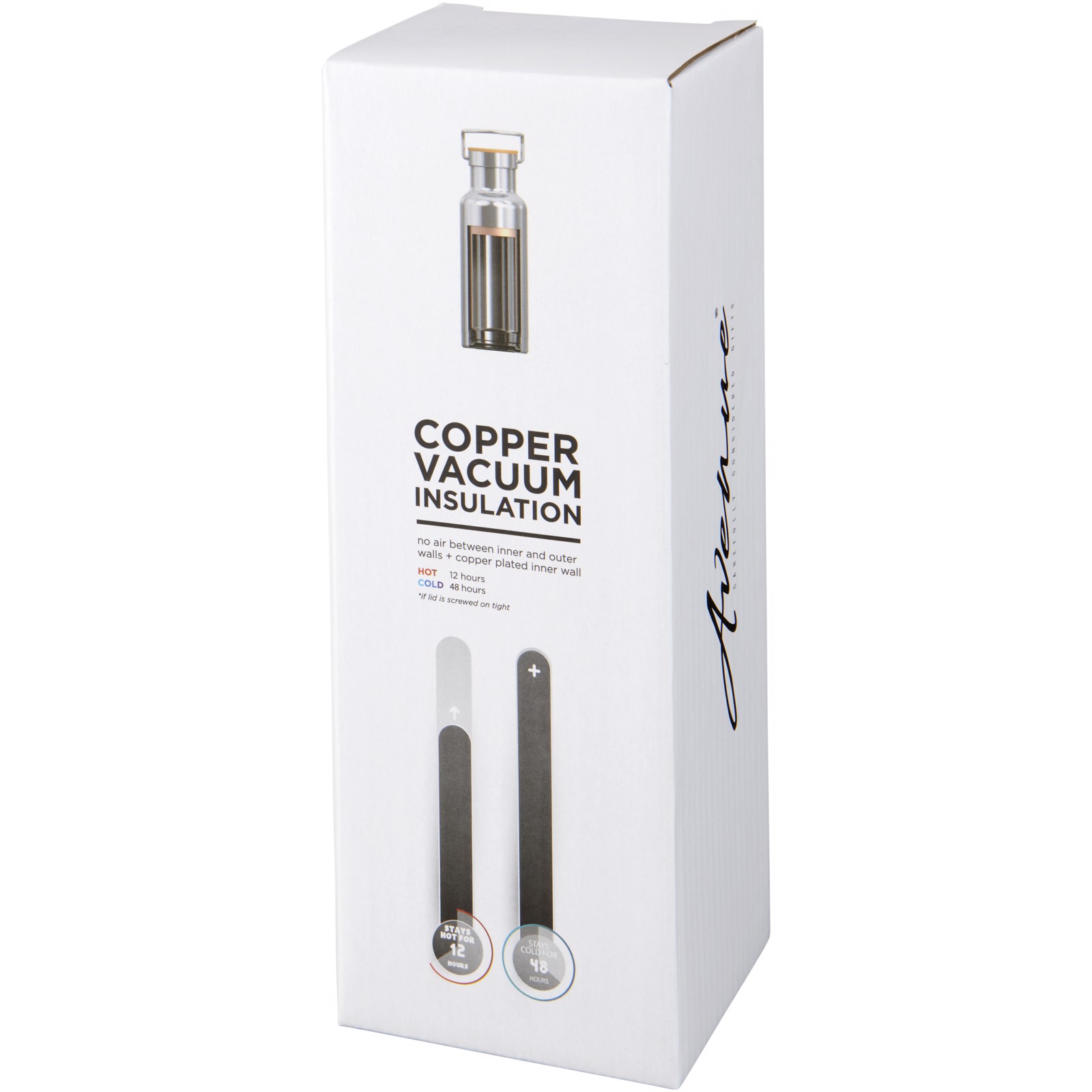 Double-walled stainless steel vacuum construction with copper insulation, which allows beverages to stay cold for 48 hours or hot for at least 12 hours. The construction also prevents condensation on the outside of the bottle. Screw-on lid with wood detail. On-trend, durable powder coating. Volume capacity is 480ml. Presented in an Avenue gift box.