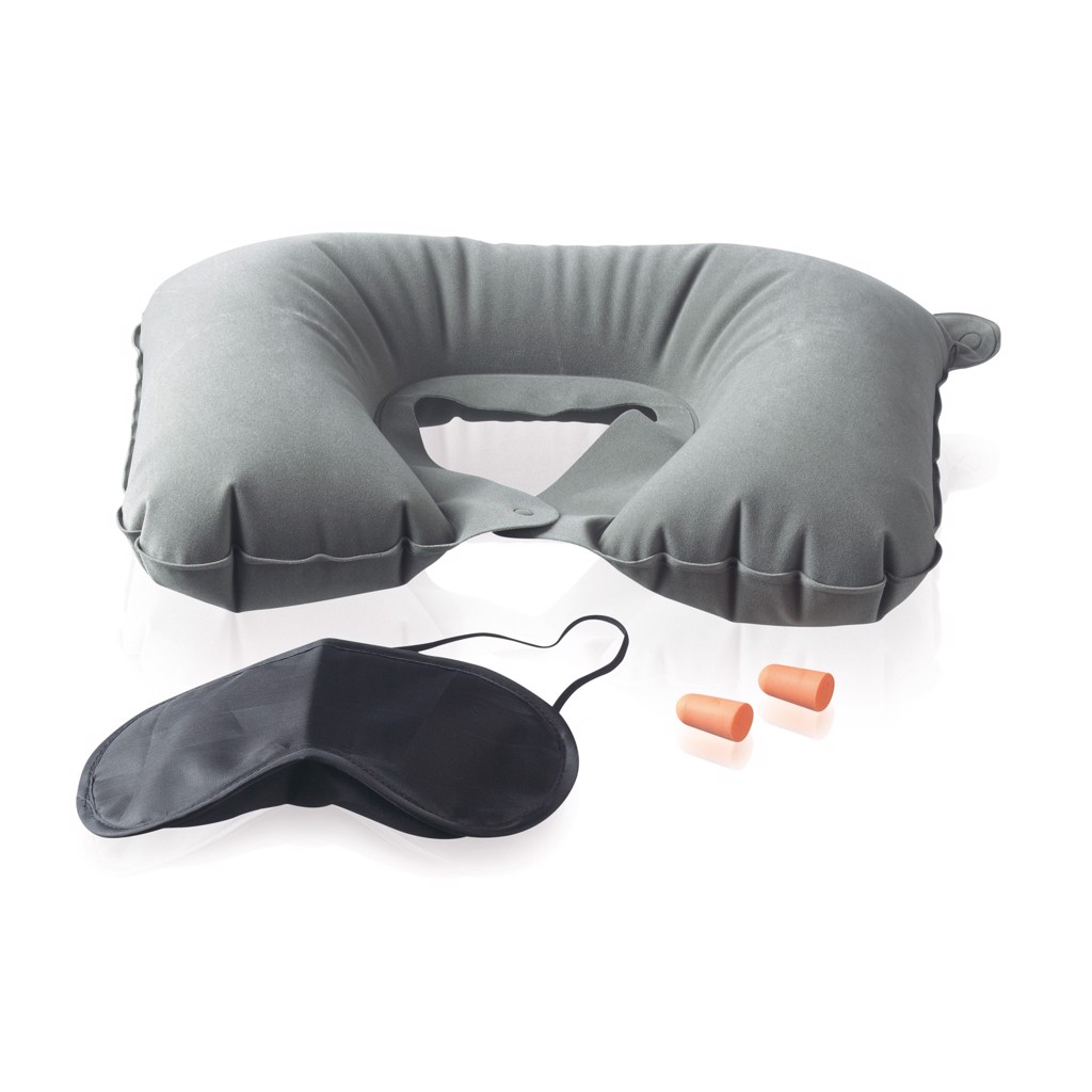 Including earplugs, eye cover and inflatable neck cushion in pouch.