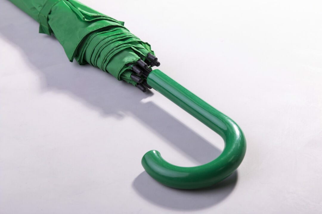 Umbrella with 8 panels in a wide range of bright tones and 107cm in diameter. Automatic opening, in resistant polyester material, with black metallic ribs and matching color handle. Automatic