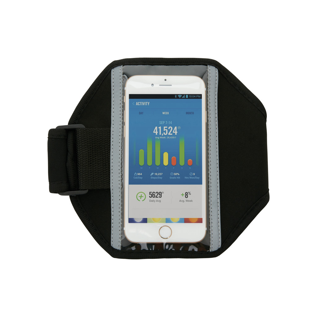 Neoprene sport armband that fits all common mobile phones (Iphone 5, 6, 7, 8, X and Xs' Samsung S6, S7, S8 and S9) so you can take them on your run or other activity. The front has a reflective strip around the window for extra visibility in the dark. The velcro can be adjusted to various sizes.