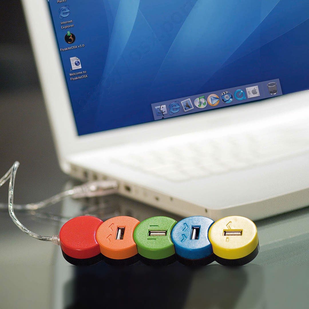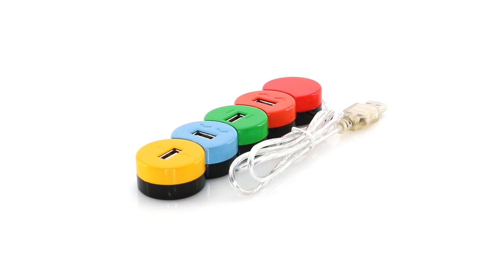 Original USB 2.0 hub in fun, full color circular design. With 4 USB ports and with a transparent finishing connection cable. With a plain printing area and presented in an individual box. 4 Hubs. USB 2.0