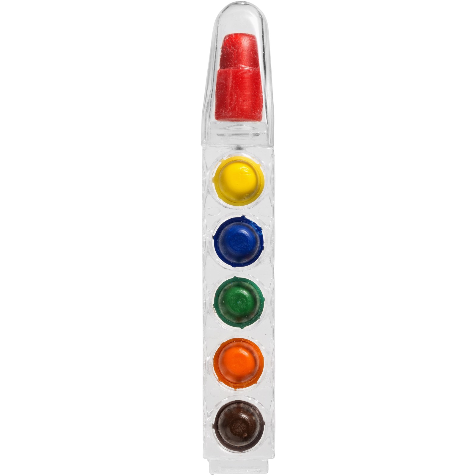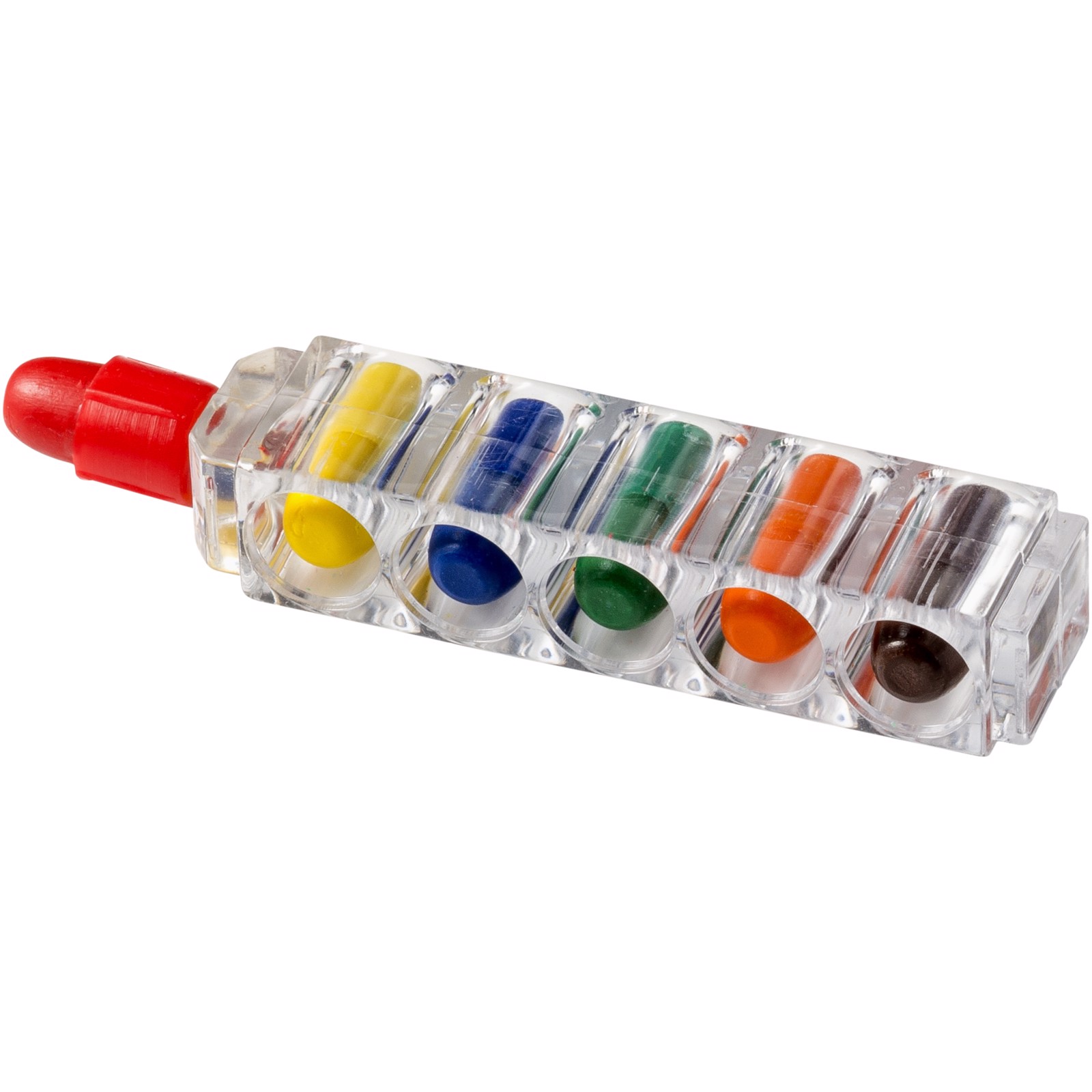 Waxy 6-piece crayon set with clear casing. 6 coloured wax crayons in clear casing. Decoration not available on components. ABS Plastic.