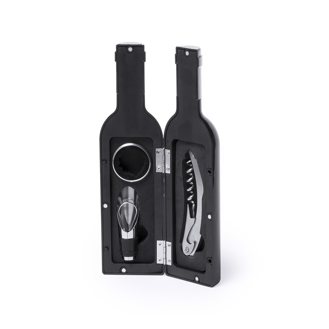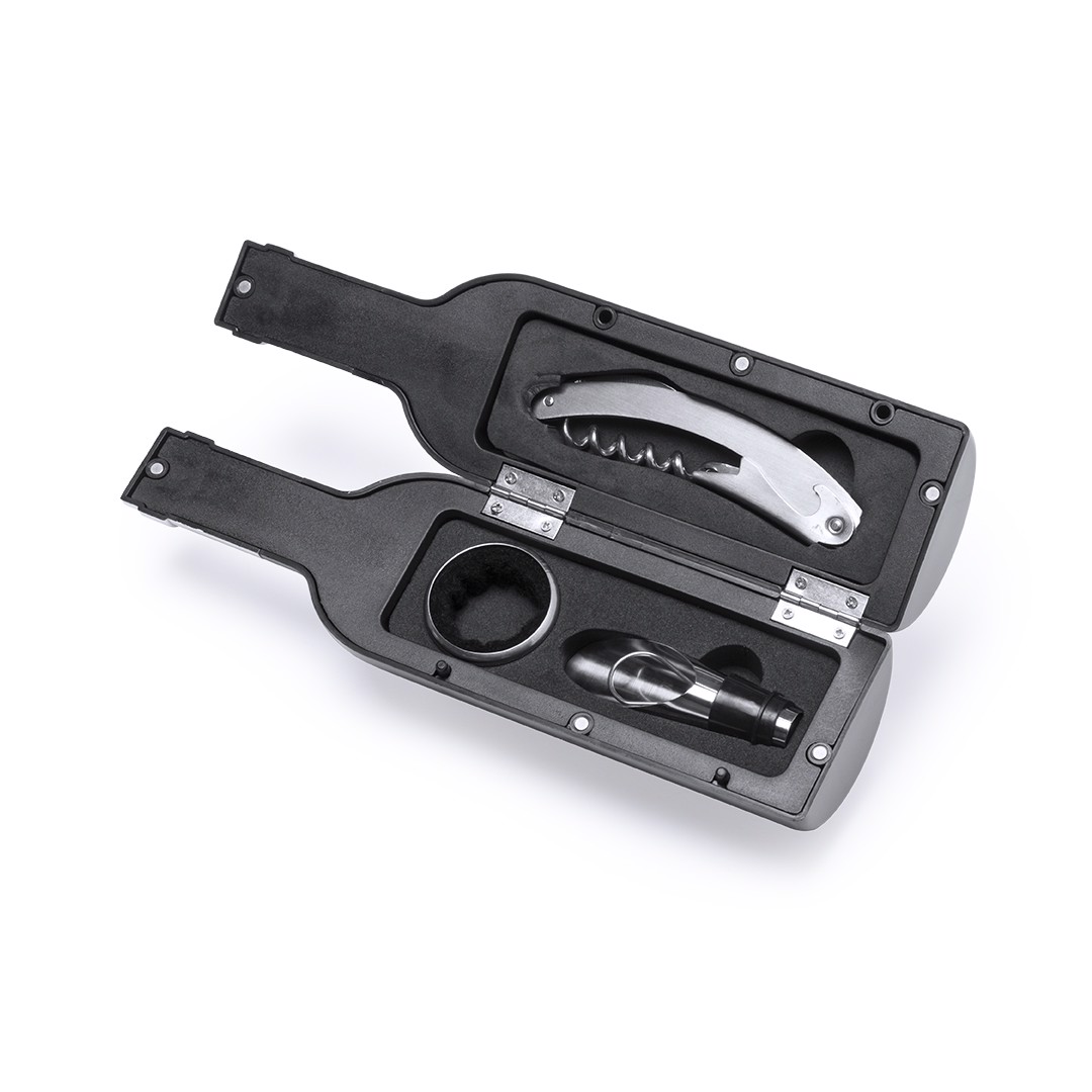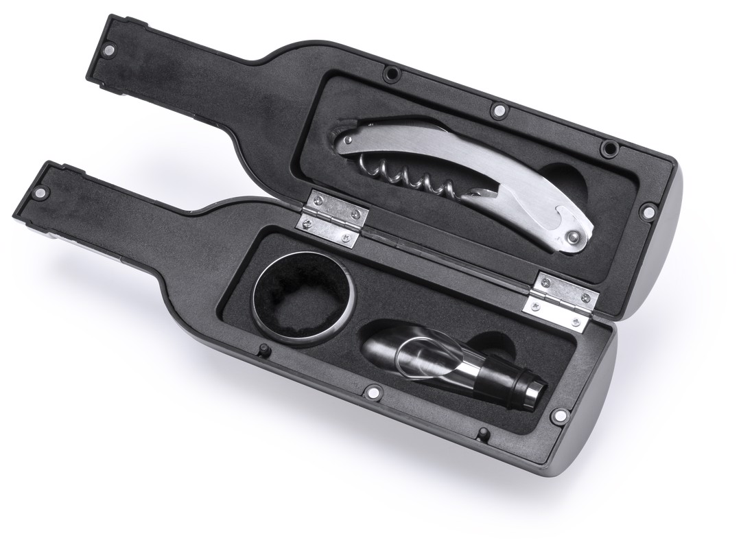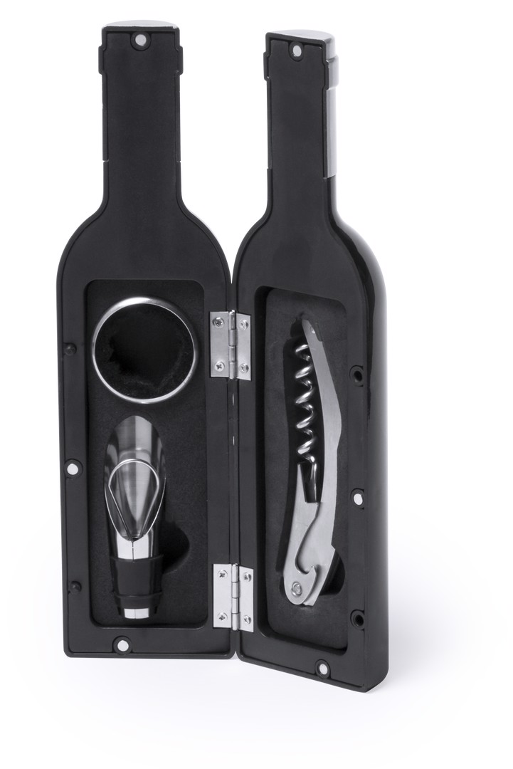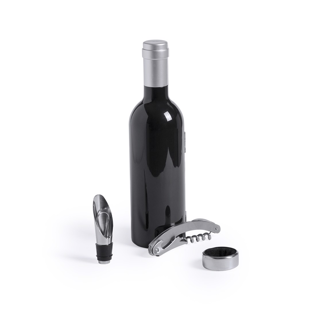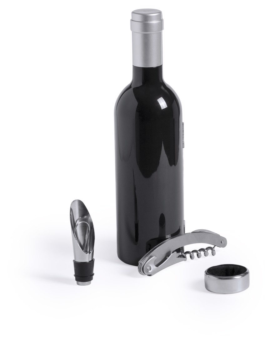 Original wine set, bottle shaped, with a shiny finish, magnetic closure and stainless steel accessories. Includes corkscrew with capsule cutter and opener, dosing cap, drip stop, capsule cutter and stopper. Presented in an individual case with inside in soft foam. 3 Accessories