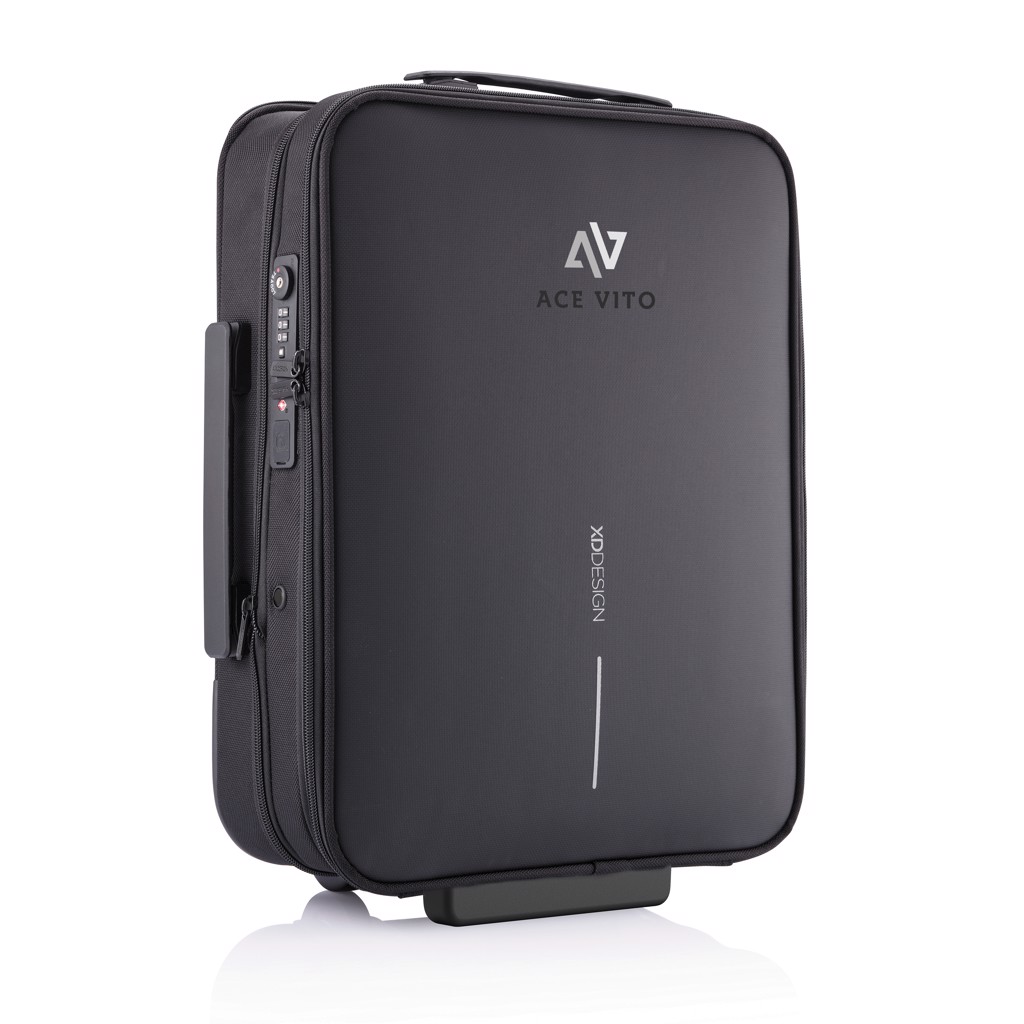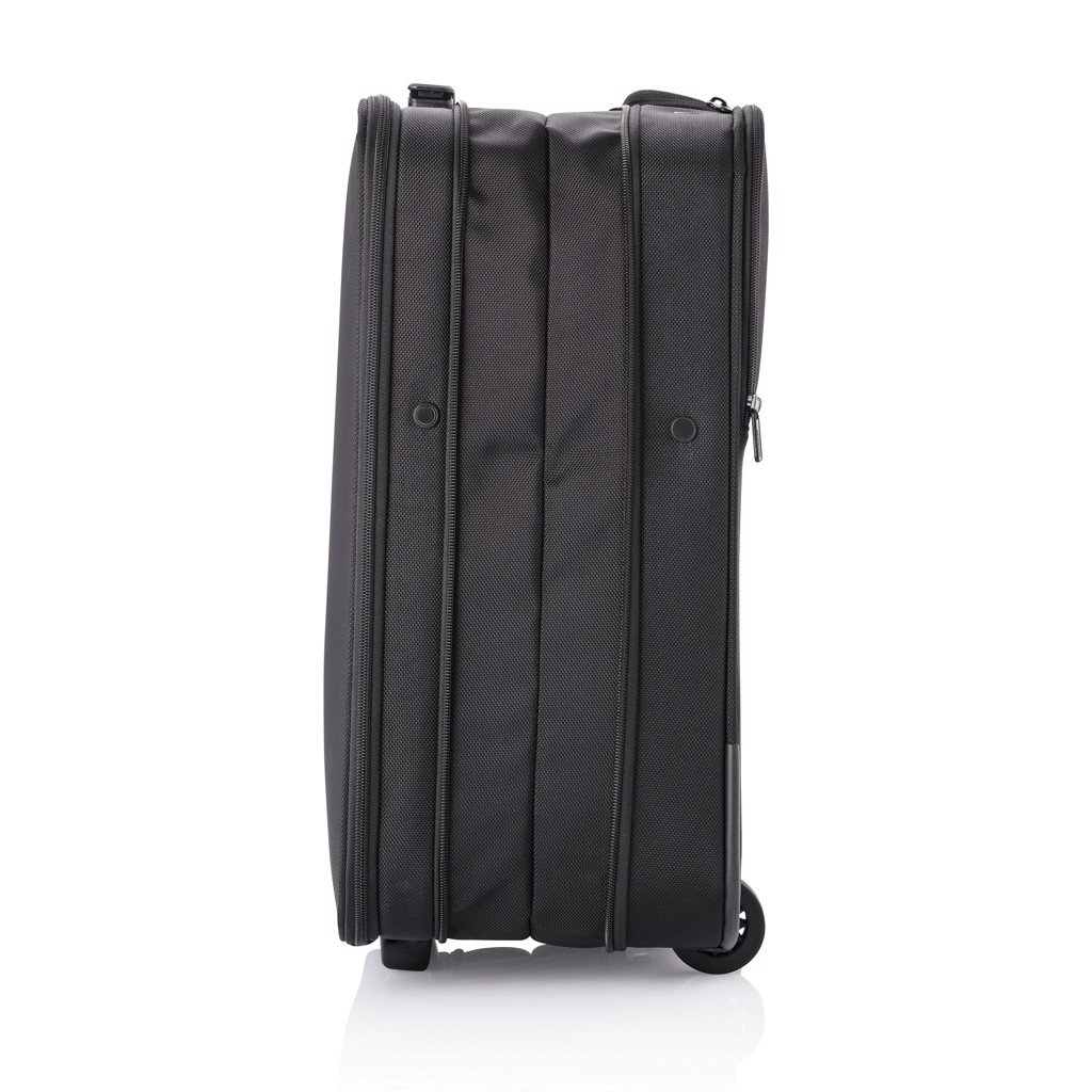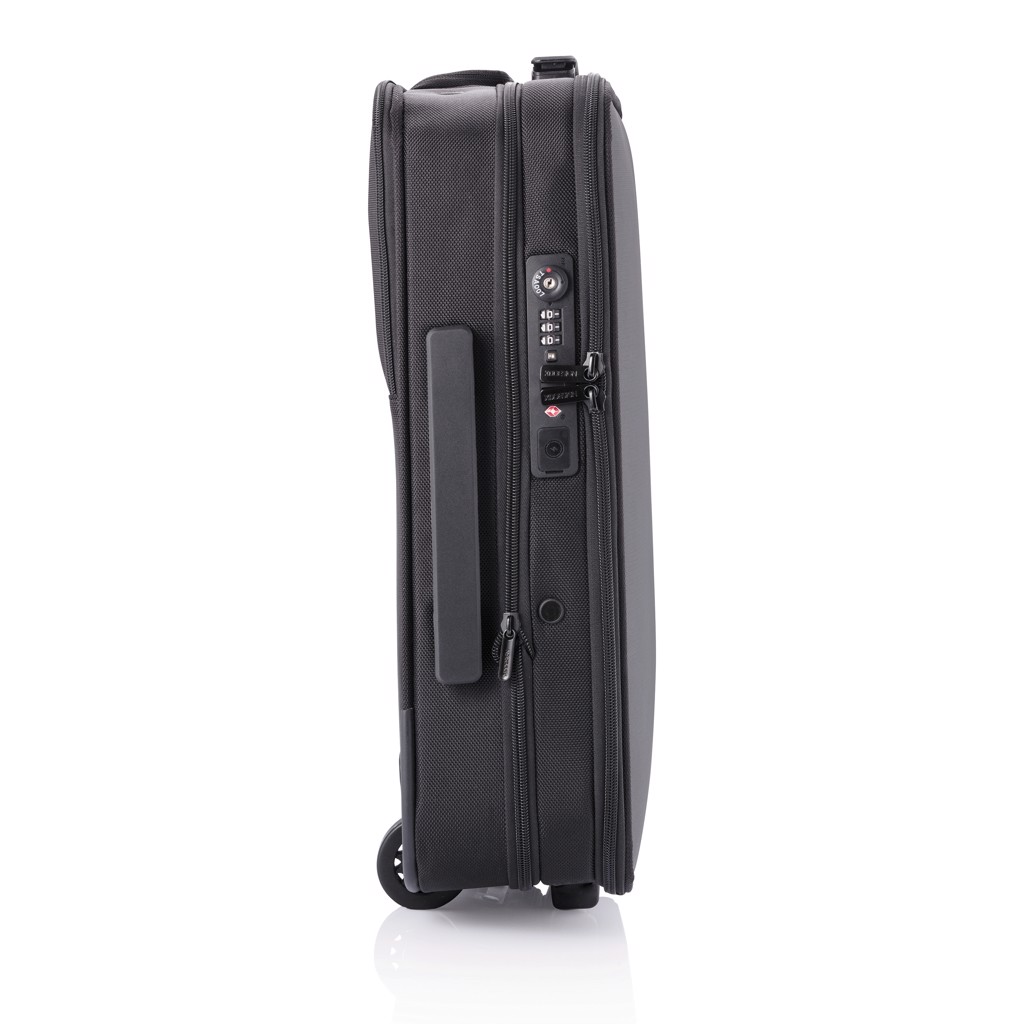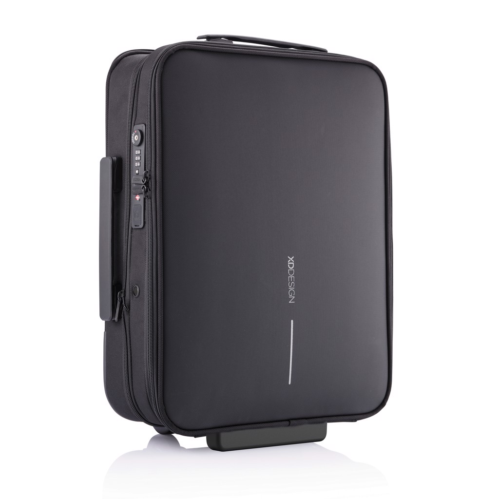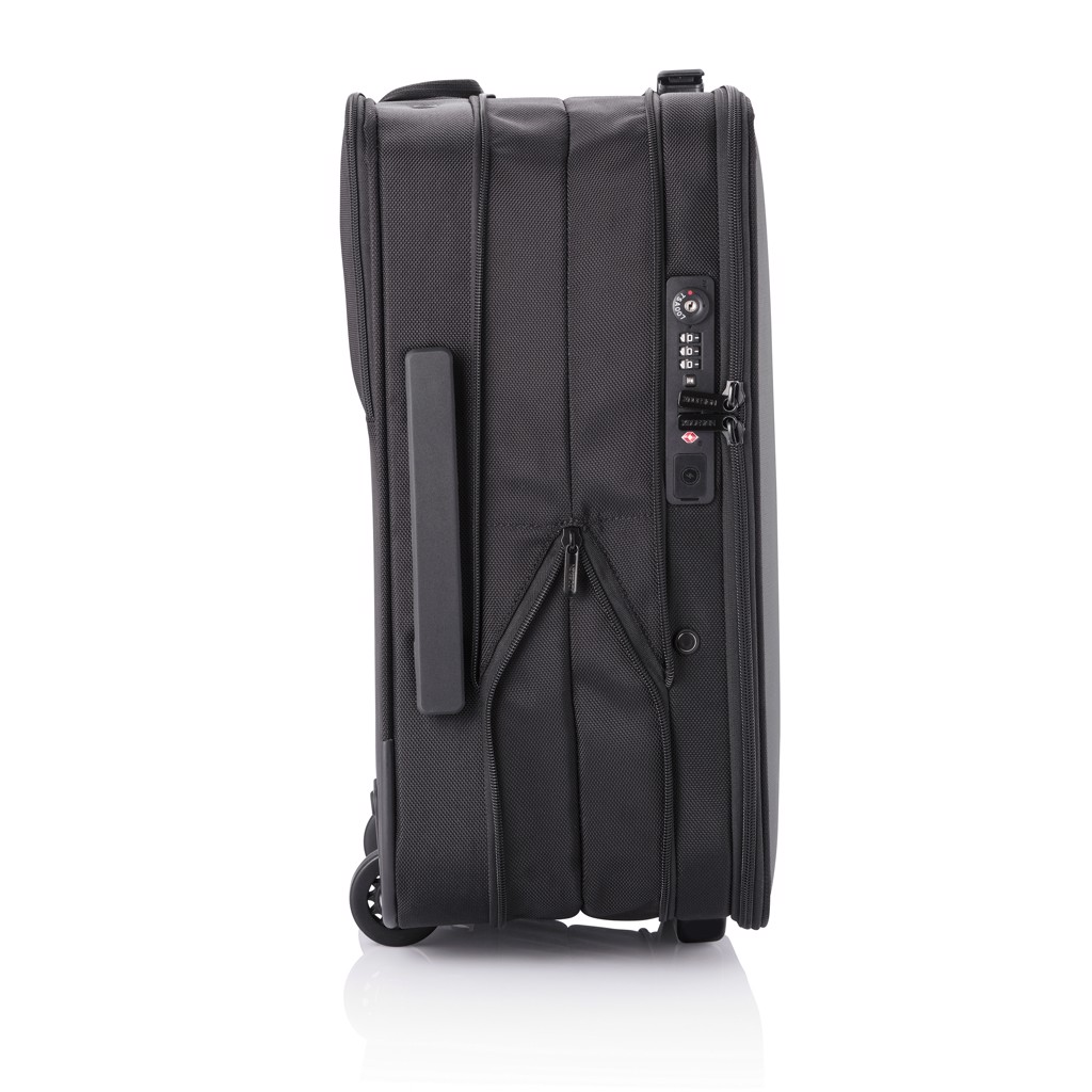 The Flex Foldable Trolley is the first business suitcase and carry-on luggage in one bag. The unique foldable design allows you to expand the bag or to save up to 50% space. This trolley is convenient on the airport security check, as the front opening gives you quick access to your laptop and to your toiletry items. These can be stored in the complementary transparent liquid bag which is fixed with an exclusive magnetic lock making it very easy to take out and put it back in the bag. Pack in a smart way! Inside you can find an organising board that stores small items and compresses your clothes with adjustable webbings and a magnetic click system. The Flex Foldable trolley also comes with the distinctive anti-theft design, with no front access, hidden pockets and an integrated TSA lock and USB charging port. Made from RPET with AWARE™ technology (using 52 plastic bottles saving 31 litres of water in the production process). The perfect bag for your business trips. Registered design®