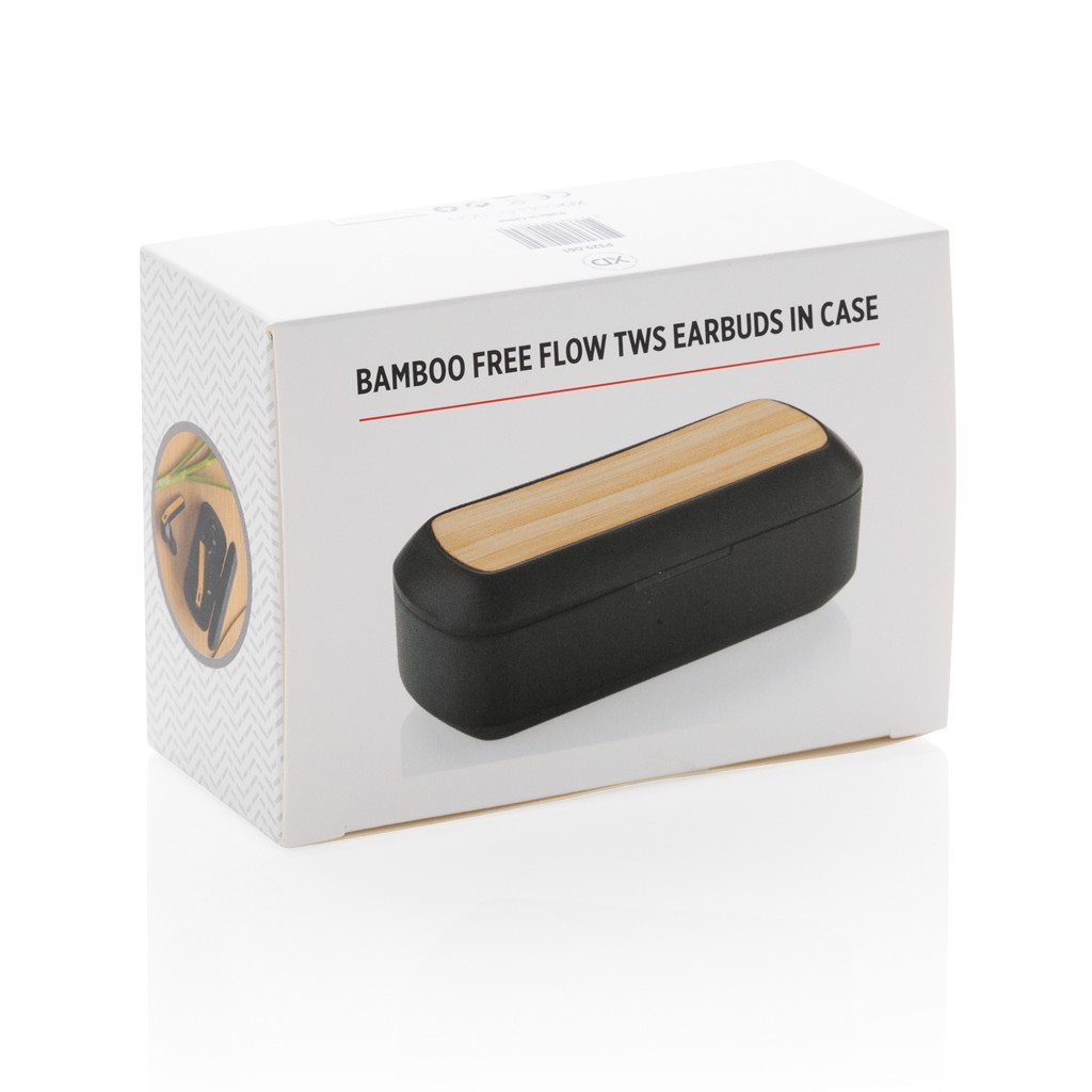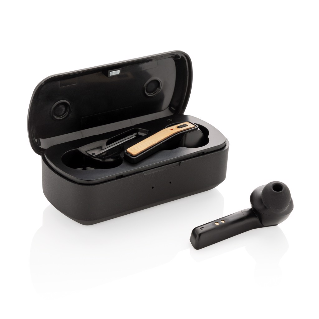 Let the music flow with these true wireless earbuds in charging case. The bamboo earbuds have a 35 mAh battery and can be re-charged in the 500 mAh charging case within 1 hour. With auto pairing function so easy to pair to your mobile device. Playing time on medium volume about 3 hours. With BT 5.0 for optimal connection. Operating distance up to 10 metres. With pick up and mic. Including 3 size silicone ear tips. Bamboo and ABS material.