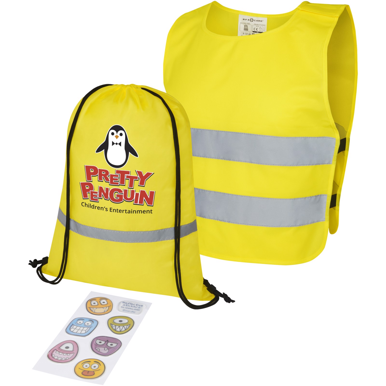Complete safety and visibility set for children aged 3 to 6 years. This back-to-school giveaway set contains a reflective drawstring backpack, safety vest, and a 6 pieces of funny reflective stickers. The reflective backpack has a large compartment with drawstring closure and is tested and certified under regulation EN 1150:1999. The high visibility vest in XXS size is suitable for children aged 3-6 years with a height between 70-104 cm. Large decoration area on the front and on the back of the vest. On the shoulder and the bottom elastic bands there are hook & loop closures, that offers extra safety and makes the vest easy to put on. The elastic bands on the other side makes it stretchable allowing for easy wearing on thick coats. The vest is tested and certified under regulations EN 1150:1999. It also adheres to the PPE guidelines on application of Regulation (EU) 2016/425 Personal Protective Equipment Category II. The reflective stickers can be placed on the backpack, bike, or bike