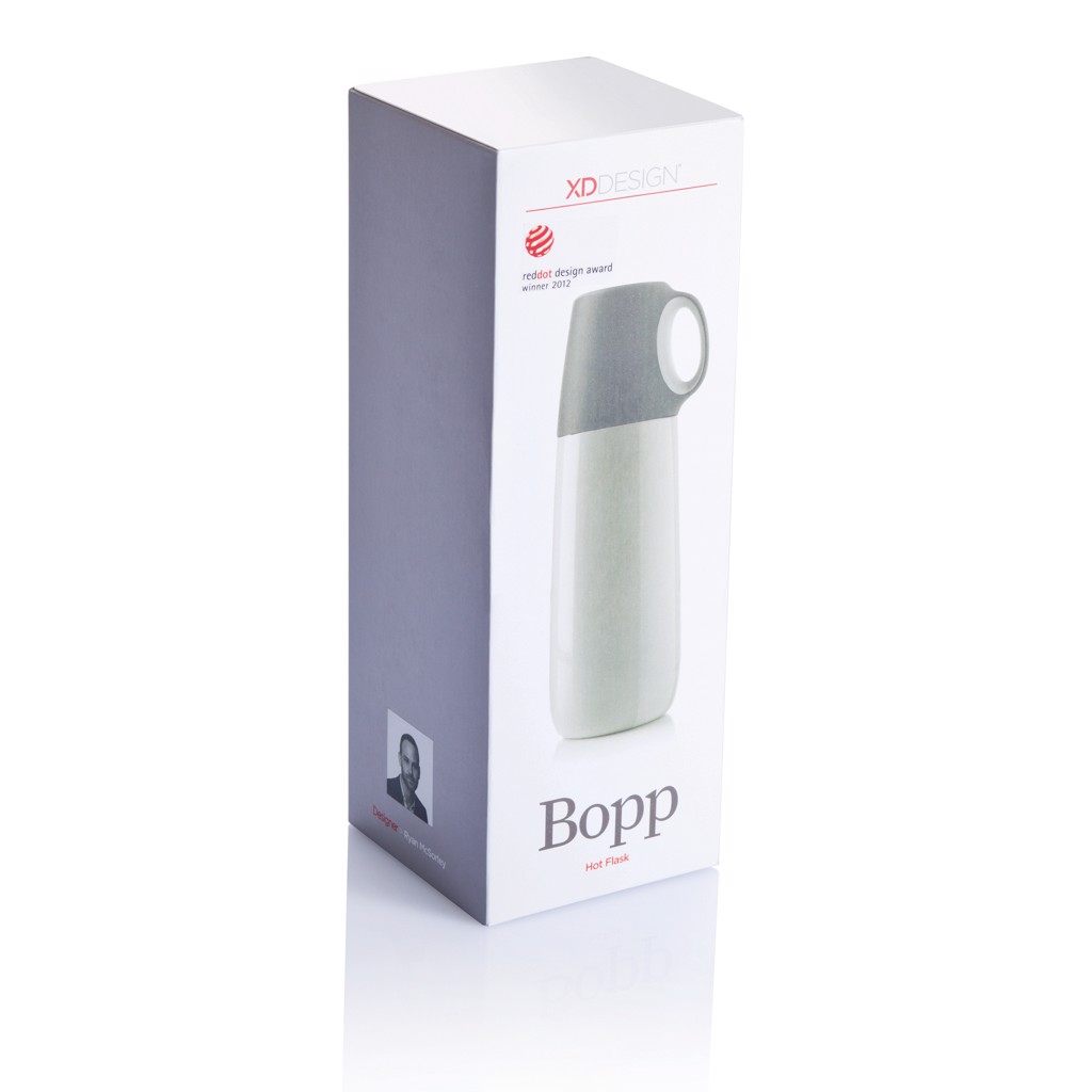 Bopp Hot is a 600ml double wall flask with matt body, push closure and cup with handle in a contrasting finish, ideal for the trendy coffee drinker. Registered design®