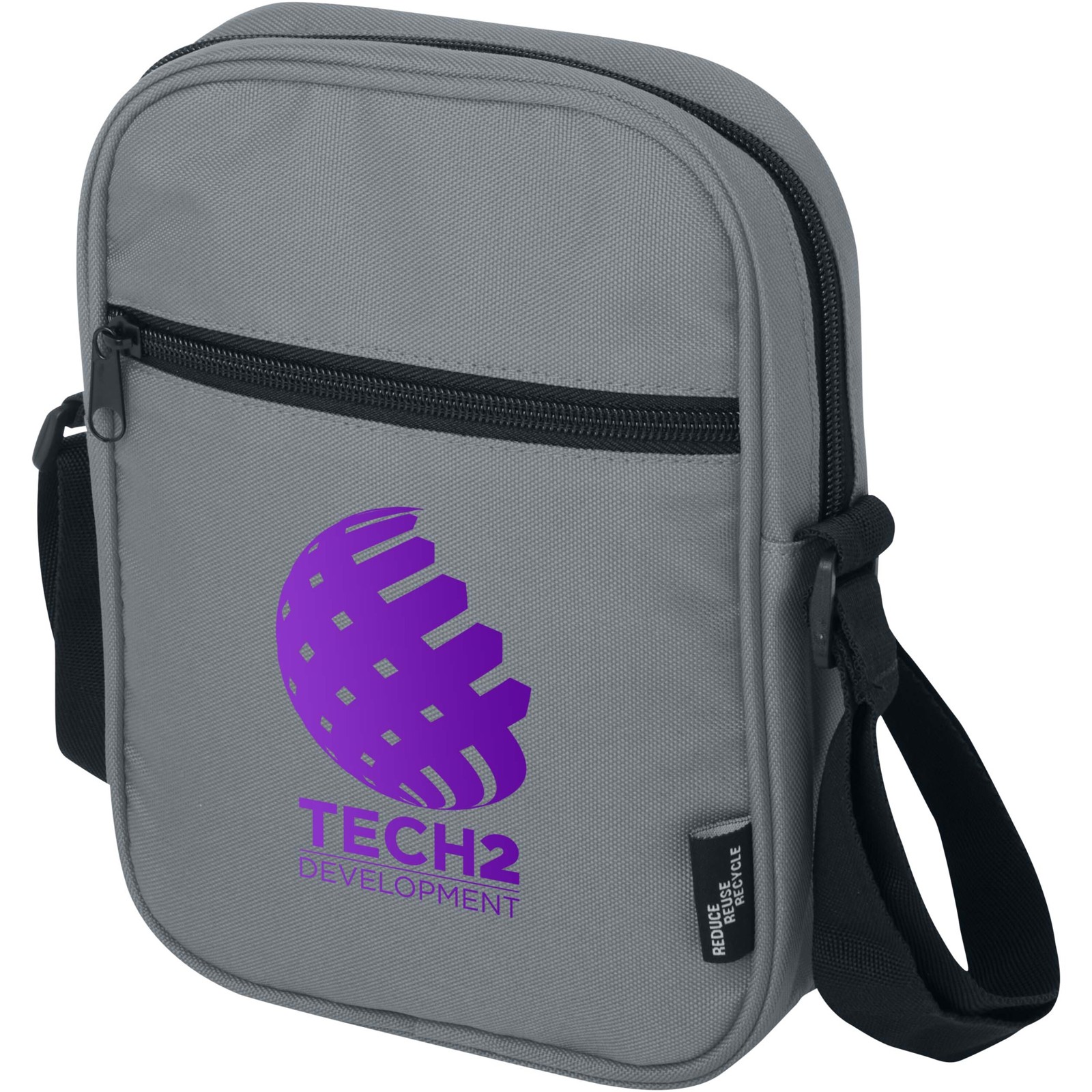 Practical and water-repellent crossbody bag made of GRS recycled polyester. It features a zipped compartment with a sleeve pocket inside to keep your everyday gadgets safely in place, a zipped front pocket for keys and valuable accessories, and an open sleeve pocket on the back for quick storage and access. With its adjustable high quality shoulder straps, the Byron crossbody bag is a perfect bag for everyday use with a minimal ecological footprint. PVC free.