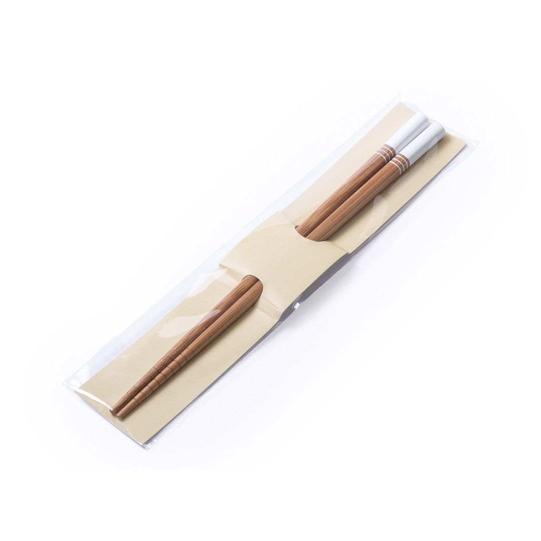 Set of 2 bamboo sticks of fine finish with accessories in sober colors. Presented in an individual cardboard case with die-cut.