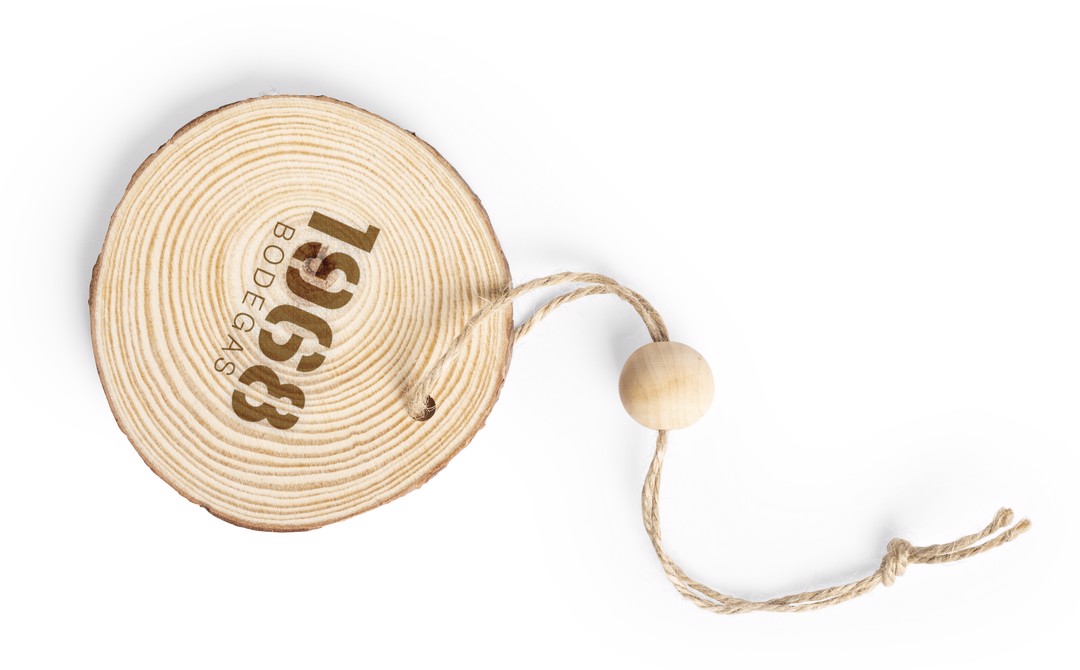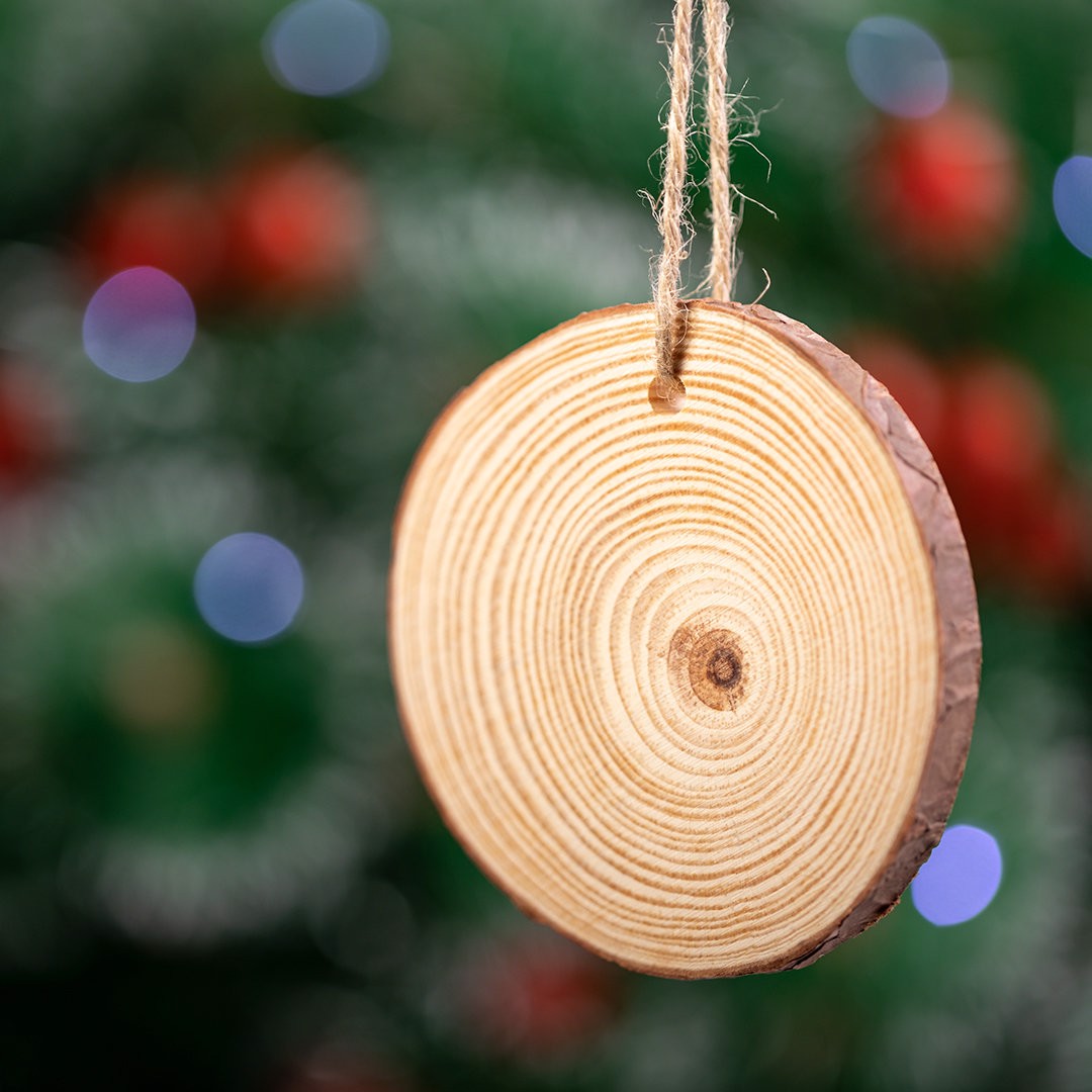 Christmas ornament in natural wood cut, with hanging ribbon and matching ball. Special for laser printing.