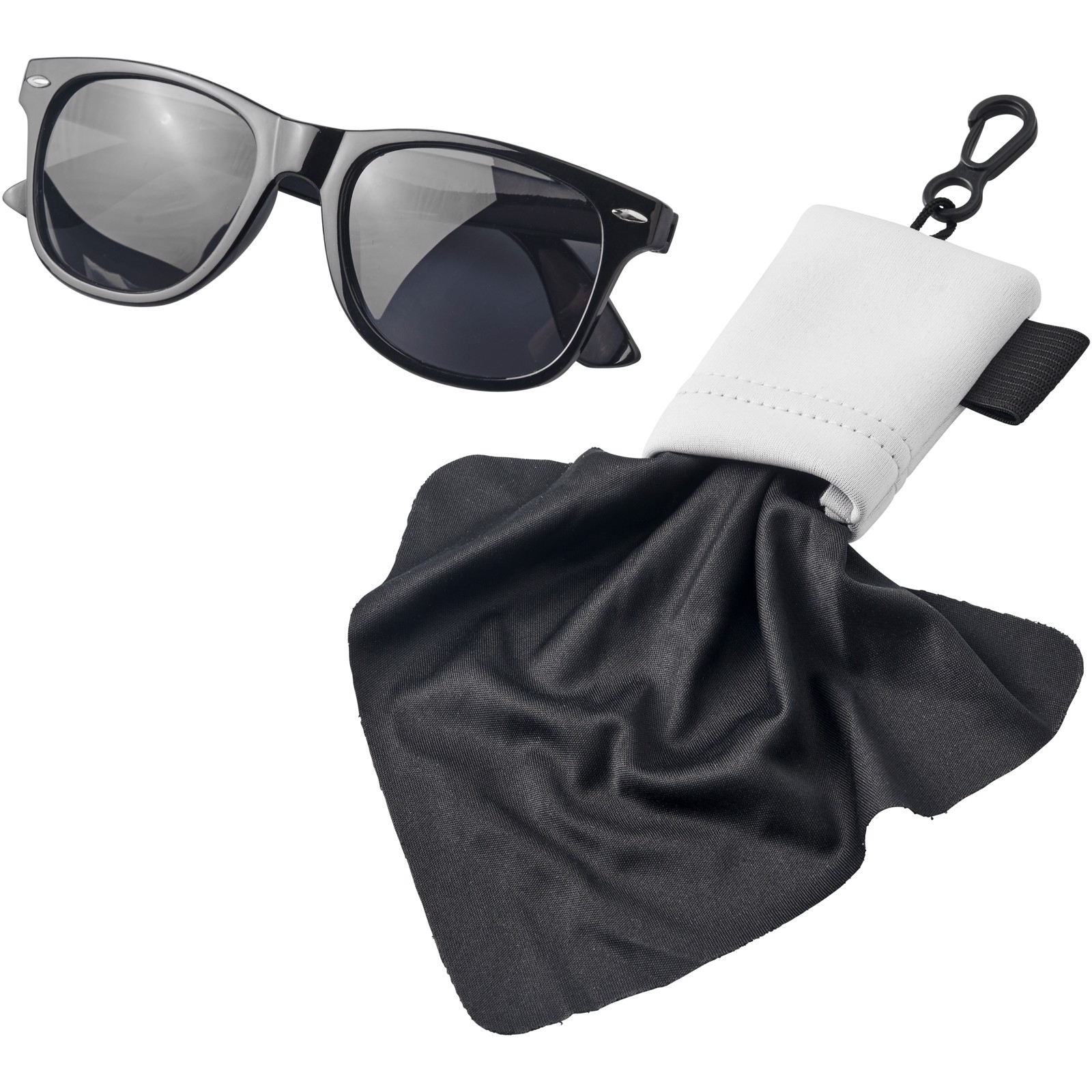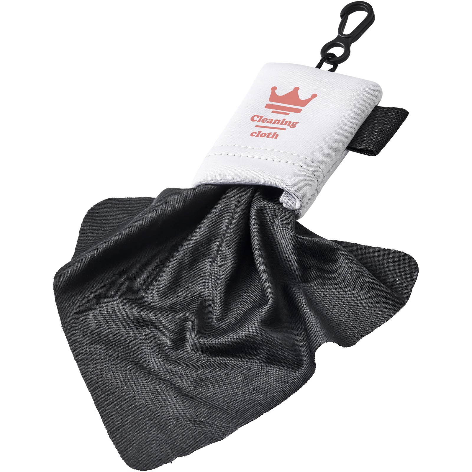 Microfiber cleaning cloth for cleaning glasses, mobile phones, computer screens, and more. Packed in pouch with snap-on carabiner for easy carrying.