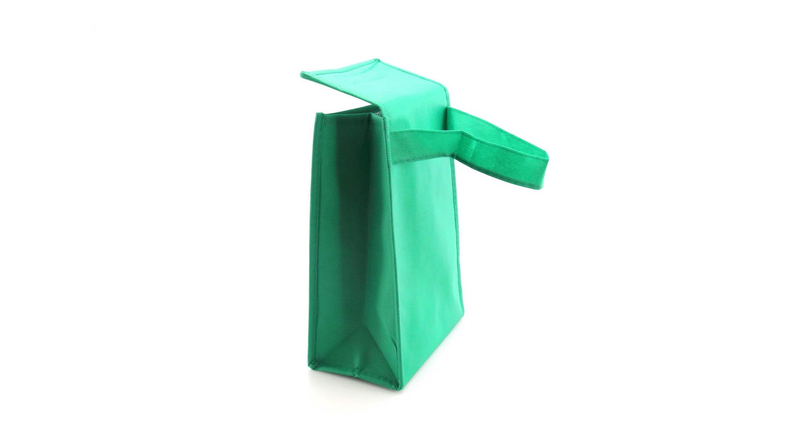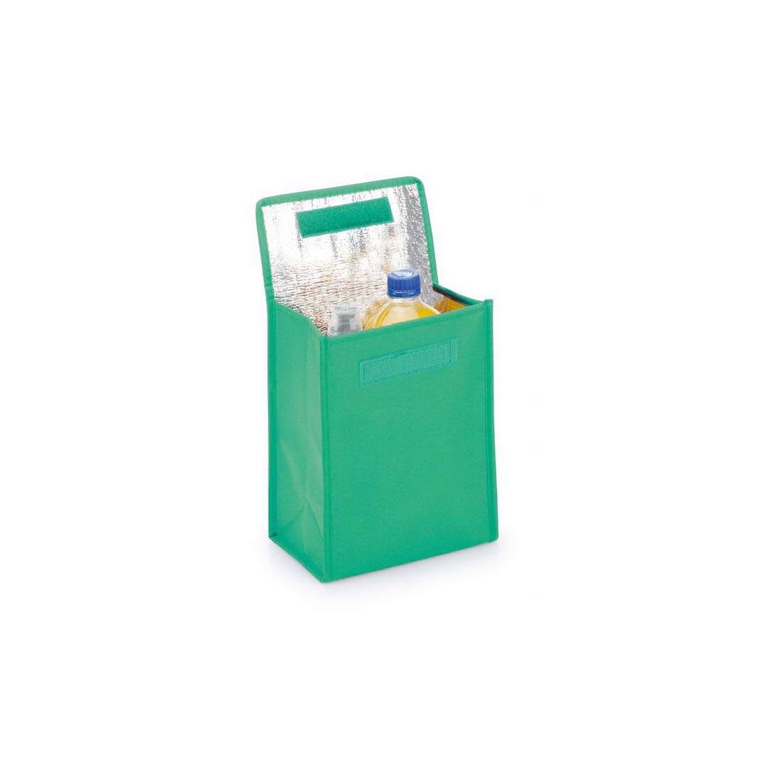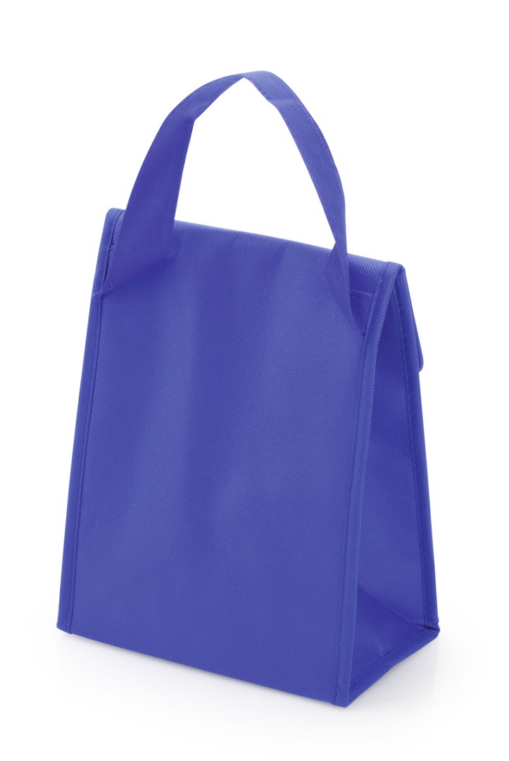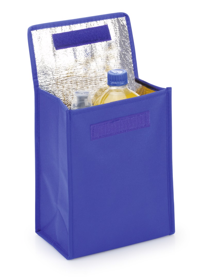 Multi purpose cooler bag in brightly colored non-woven, with velcro flap closure and desired triangular. Isothermal inside in aluminum finish.