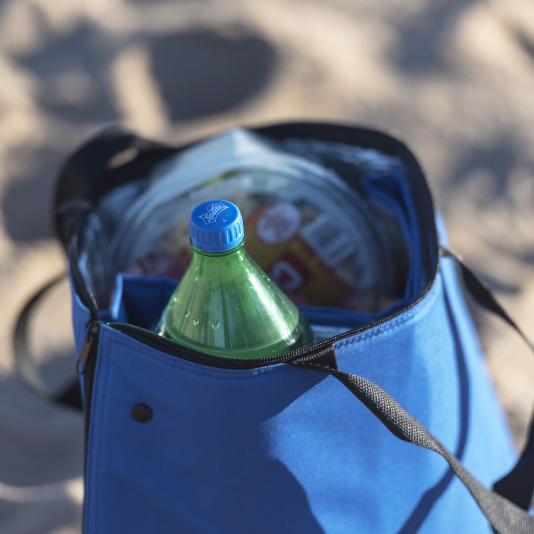 Cooler bag in resistant 600D polyester with full opening zipper closure. With comfortable carrying handles in nylon, reinforced button closures at upper corners and isothermal inside in aluminum finish.