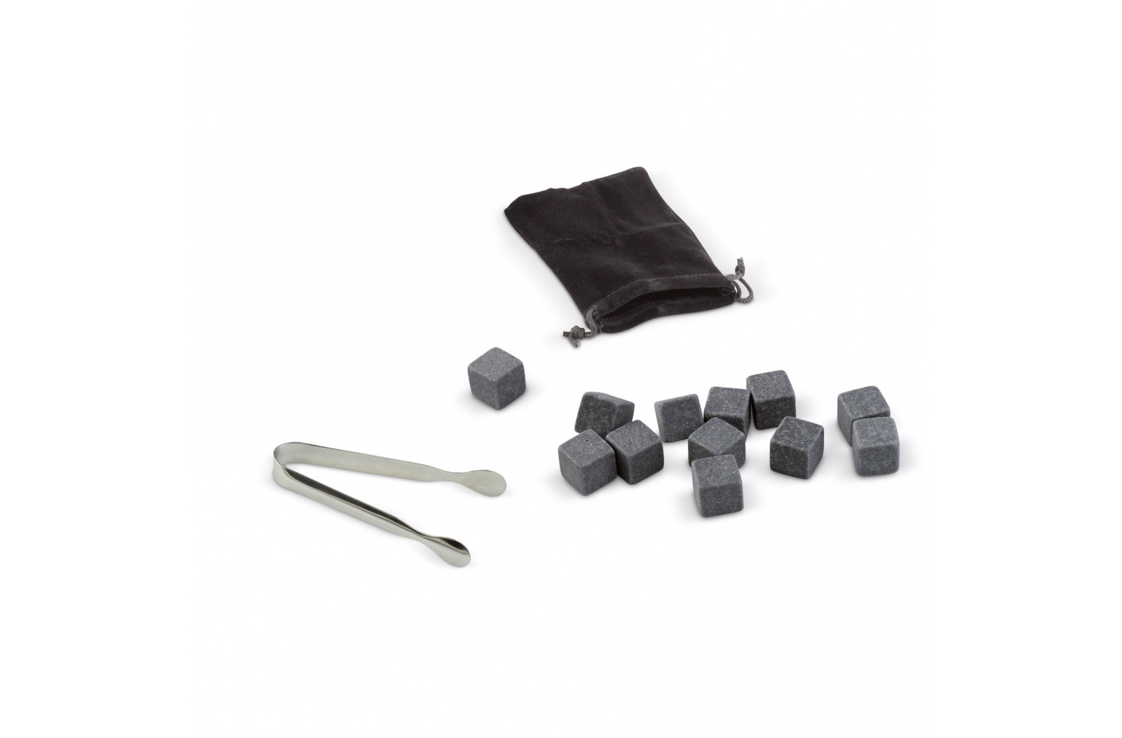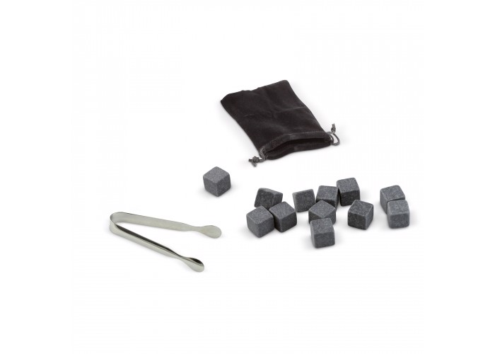 Set of twelve basalt stones that can be stored in the freezer and therefore used as ice cubes without diluting the drink. These stones are enough for four drinks and are supplied in a velvet bag including tongs. Packed in a gift box.