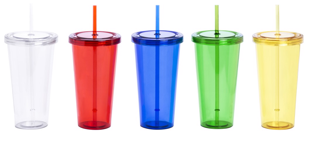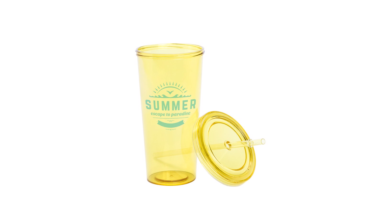 750ml PS cup, with transparent finish and in a wide range of bright tones. With screw-on cap and matching color straw. 750 ml