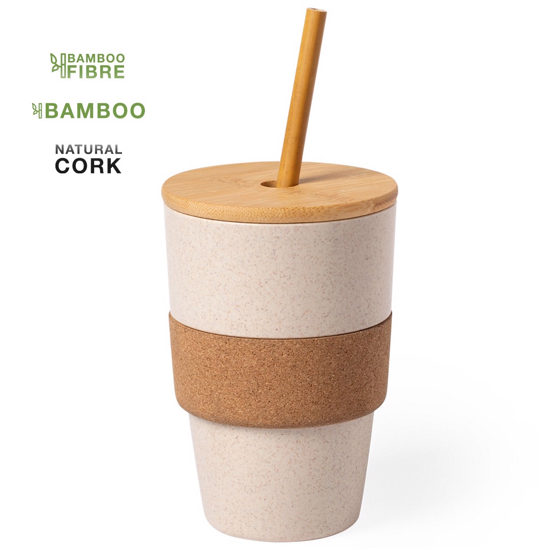 Nature line cup, made of natural cork, bamboo and bamboo fiber. 450 ml capacity, with lid in polished bamboo and straw, BPA free. Presented in an attractive, eco design box. 450 ml. Individual Presentation