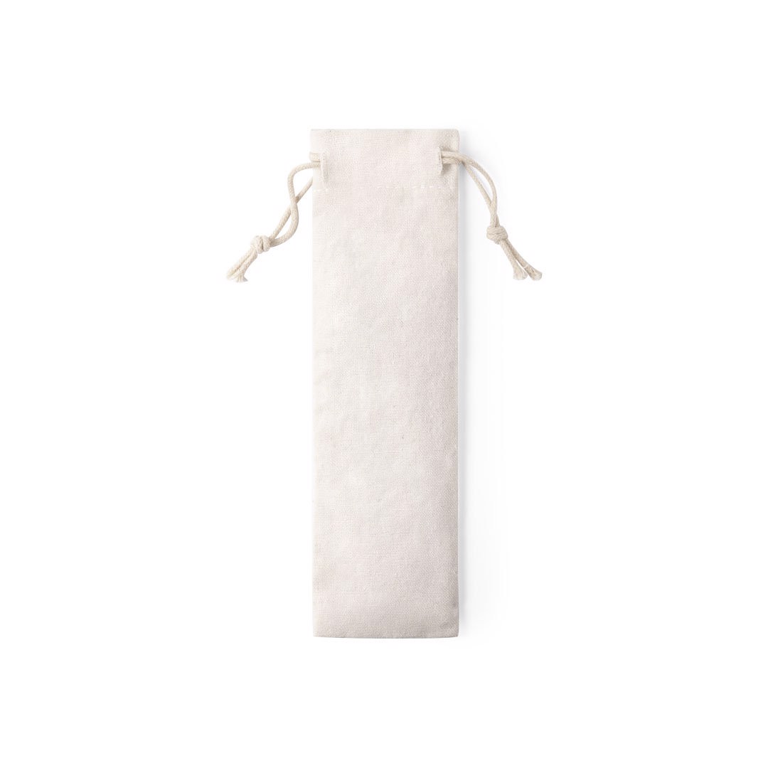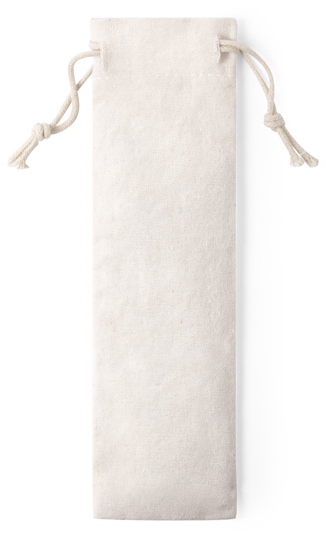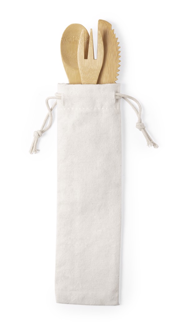 Set of cutlery in nature line. Made of bamboo, including fork, spoon and knife. Presented in a cotton pouch with self-closing strings. 3 Pieces