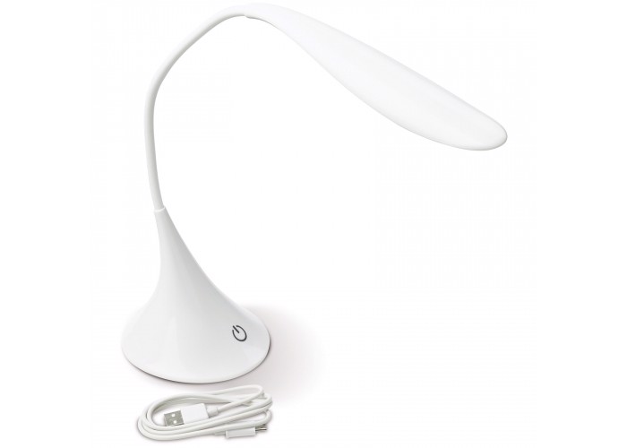 Wireless desk lamp operating on batteries and micro-USB input. The lamp can be controlled with a touch function and is easy to adjust. Batteries are not included.