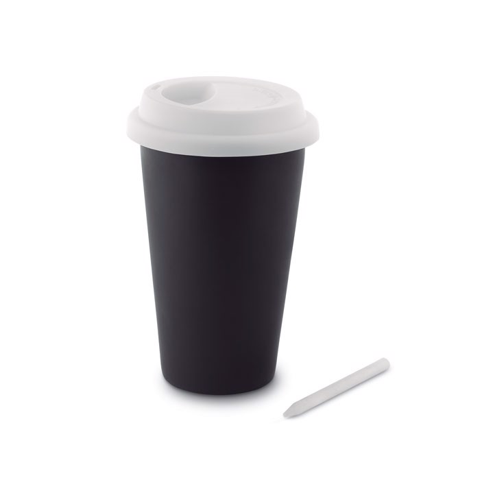 Double wall ceramic and chalk tumbler with silicone lid. Capacity 350 ml.