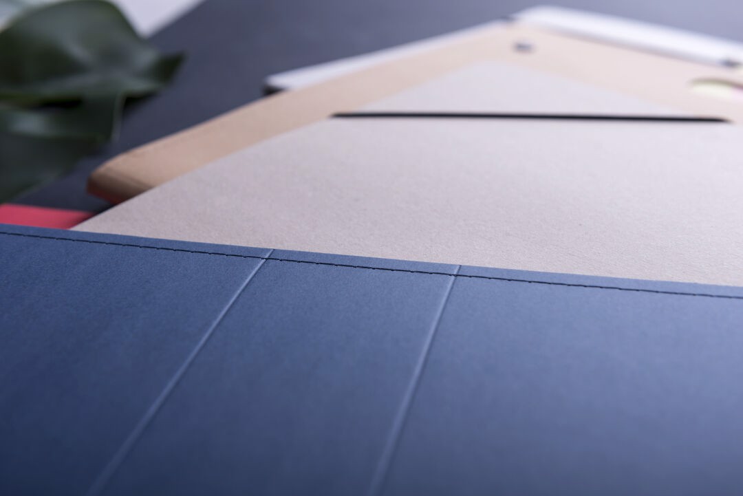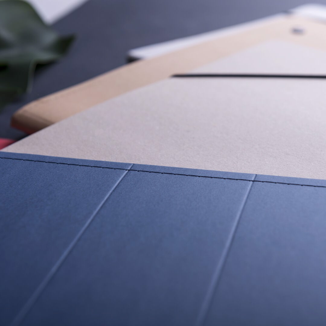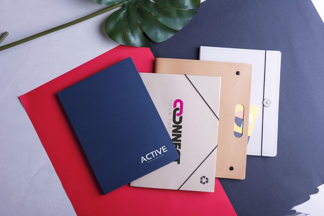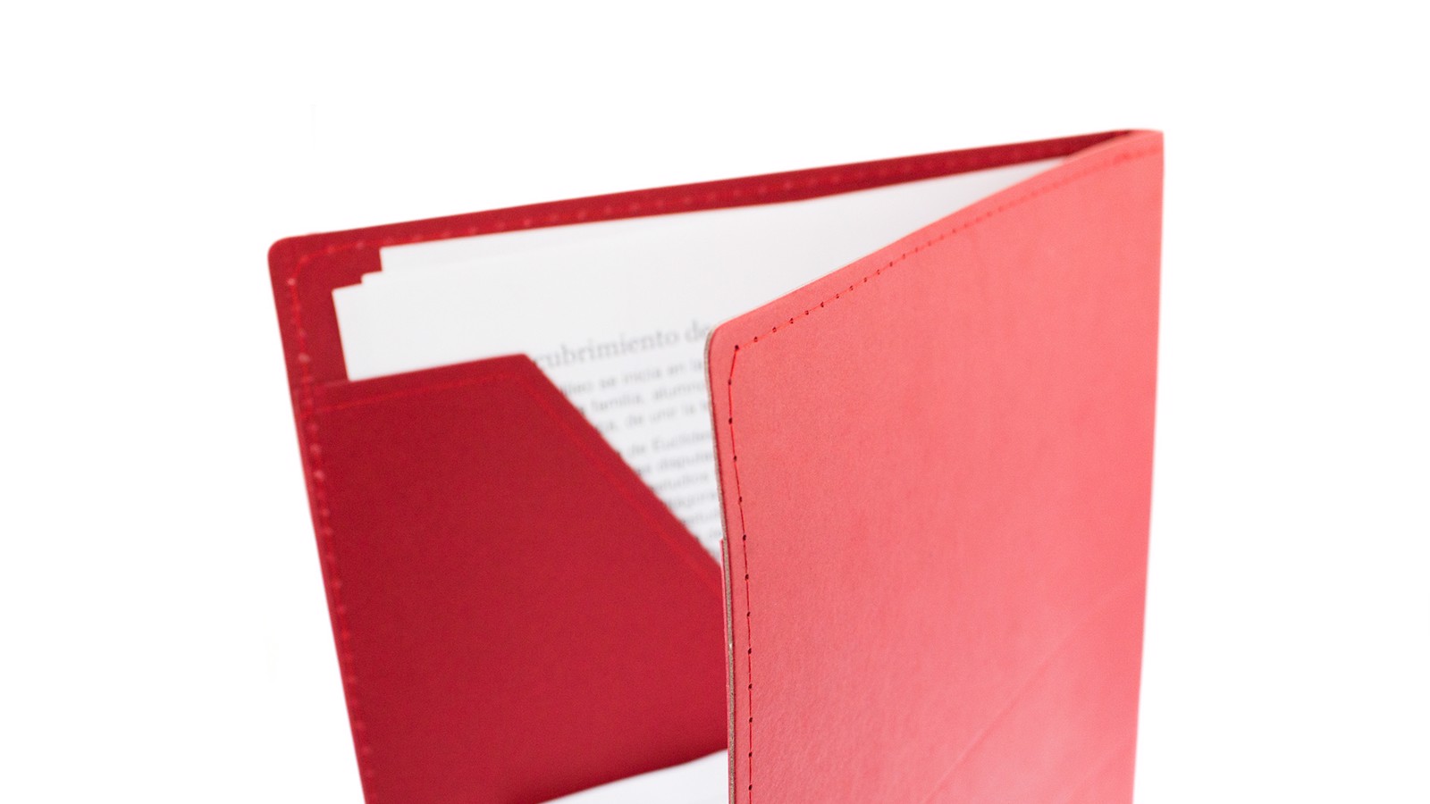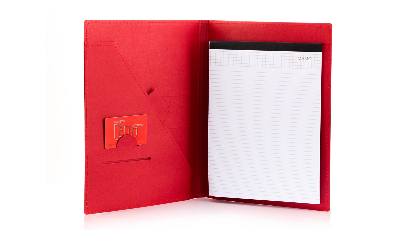 Resistant, rigid recycled cardboard folder with reinforcement stitching in a wide range of tones. Inside with removable 25-sheet notepad with striped layout, flap pocket, card holders and pen holder. 25 Sheets Notepad