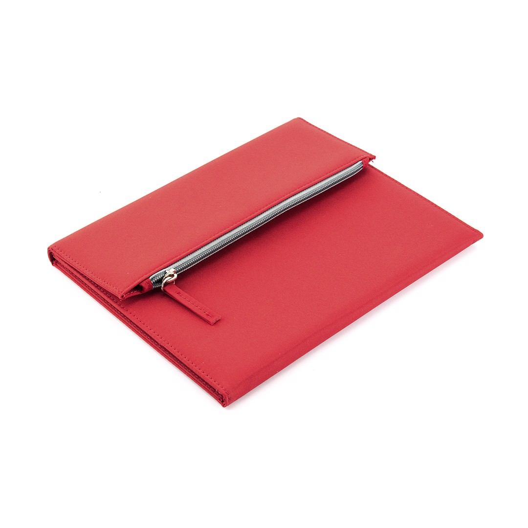 Colorful folder in soft microfibre, with zipper closure case with matching color built-in puller in the outside magnetic flap. Matching color inside with notepad of 20 sheets with striped layout, pocket and pen holder. 20 Sheets Notepad. Pencil Case Included