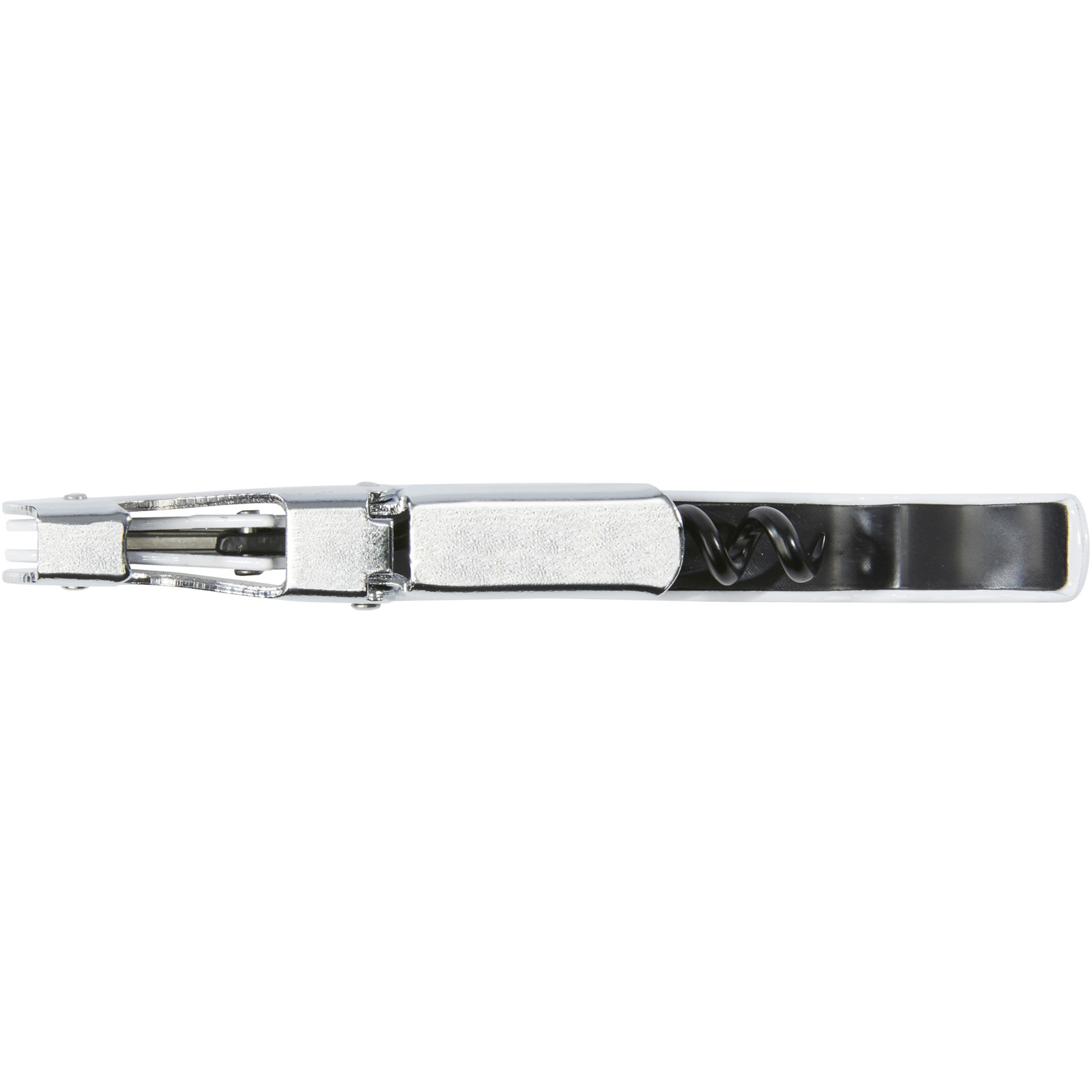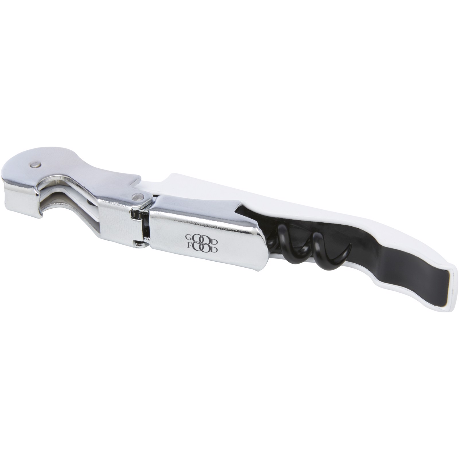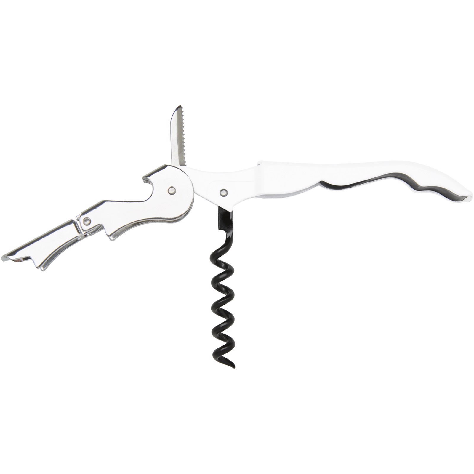 Stainless steel waitress knife with a colored body featuring a corkscrew, foil cutter, and bottle opener. With the two-step construction it's easy to pull the cork out from the bottle.