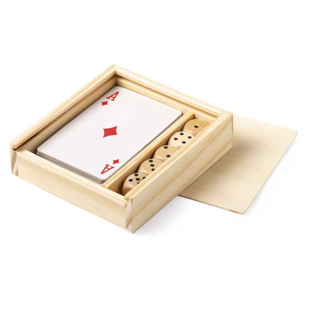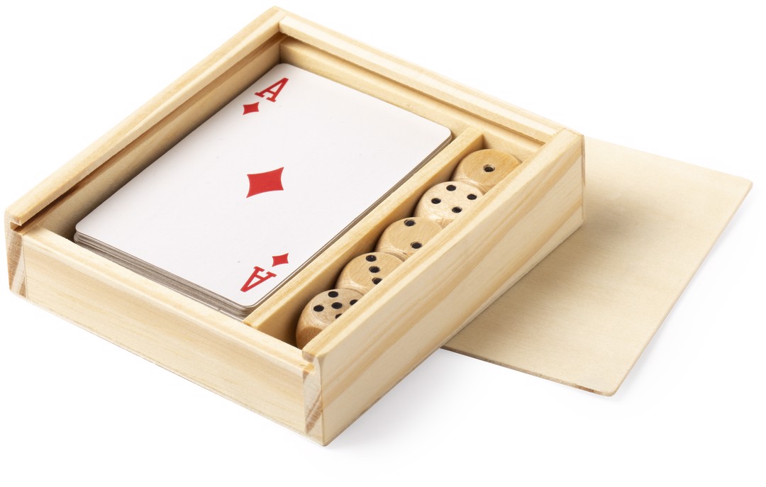 Set of board games with french cards and 4 wooden dices, presented in an individual wooden case with sliding cover. 2 Games