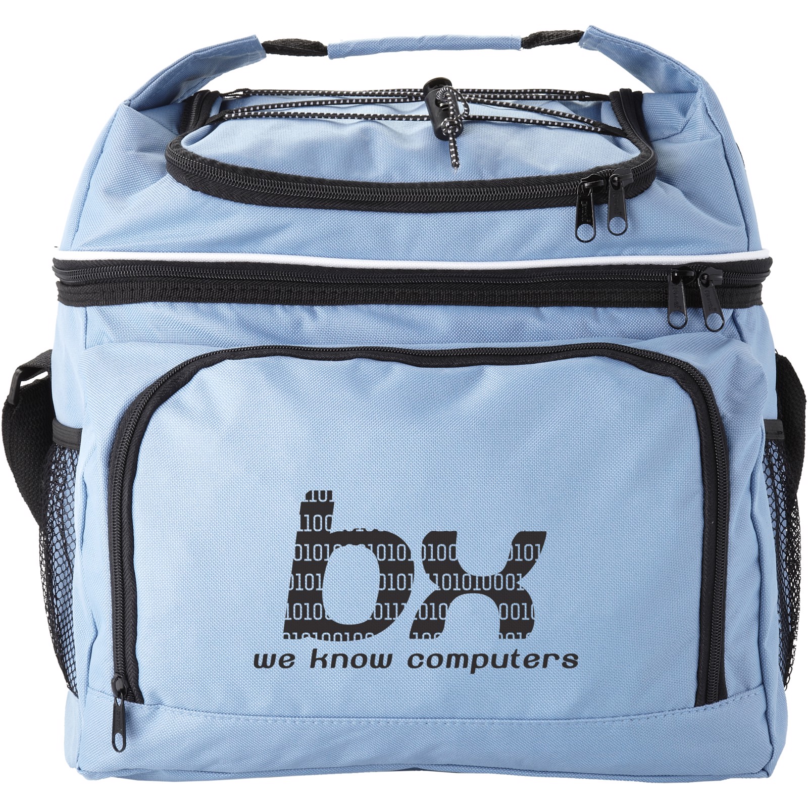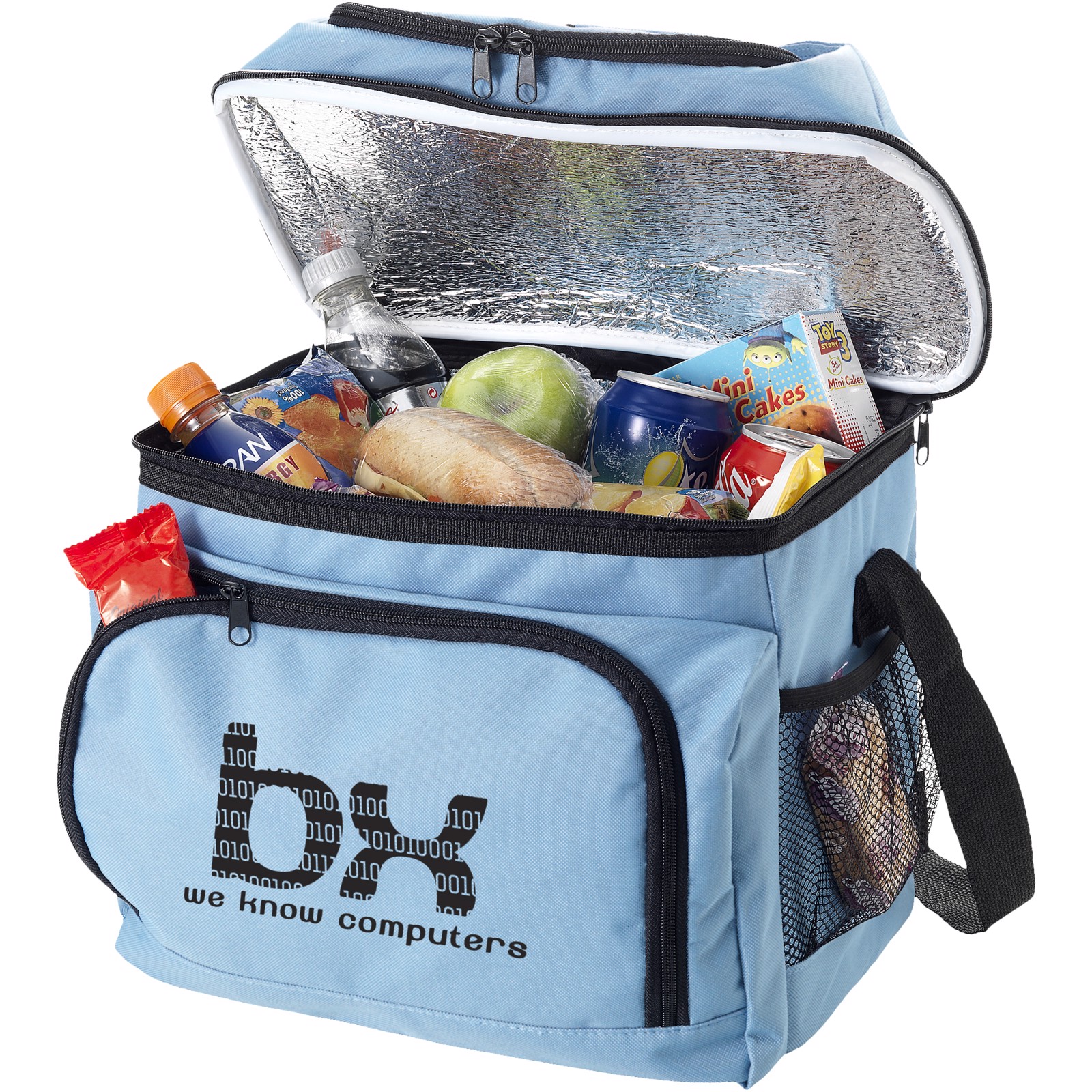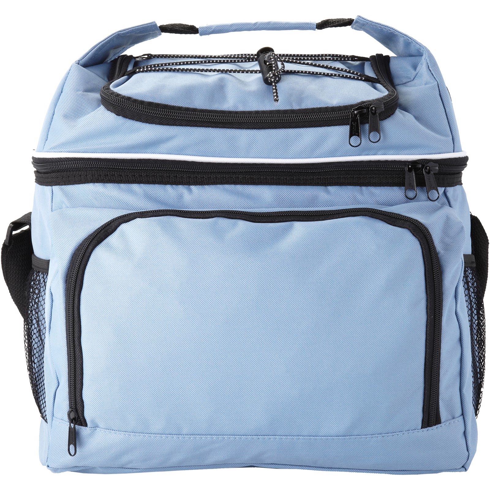 Cooler bag with front pocket and convenient pocket on top to store snacks. The integrated handle gives this bag a characteristic look.