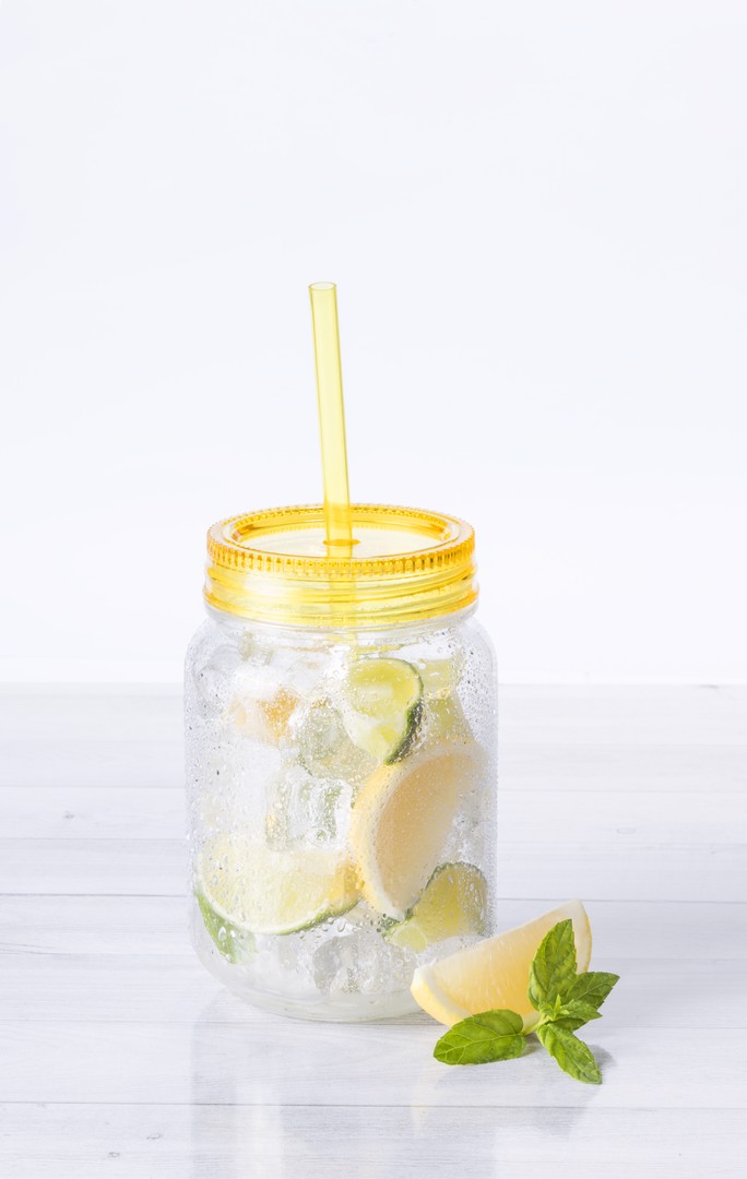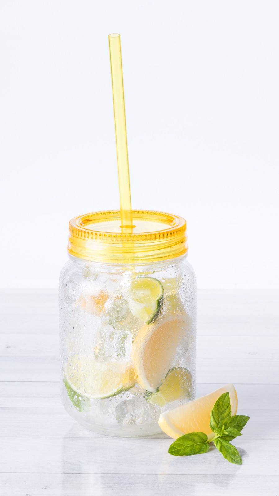 600ml, fun design PS jar with transparent body and accessories in a wide range of bright tones. With screw-on cap and matching color straw. 600 ml