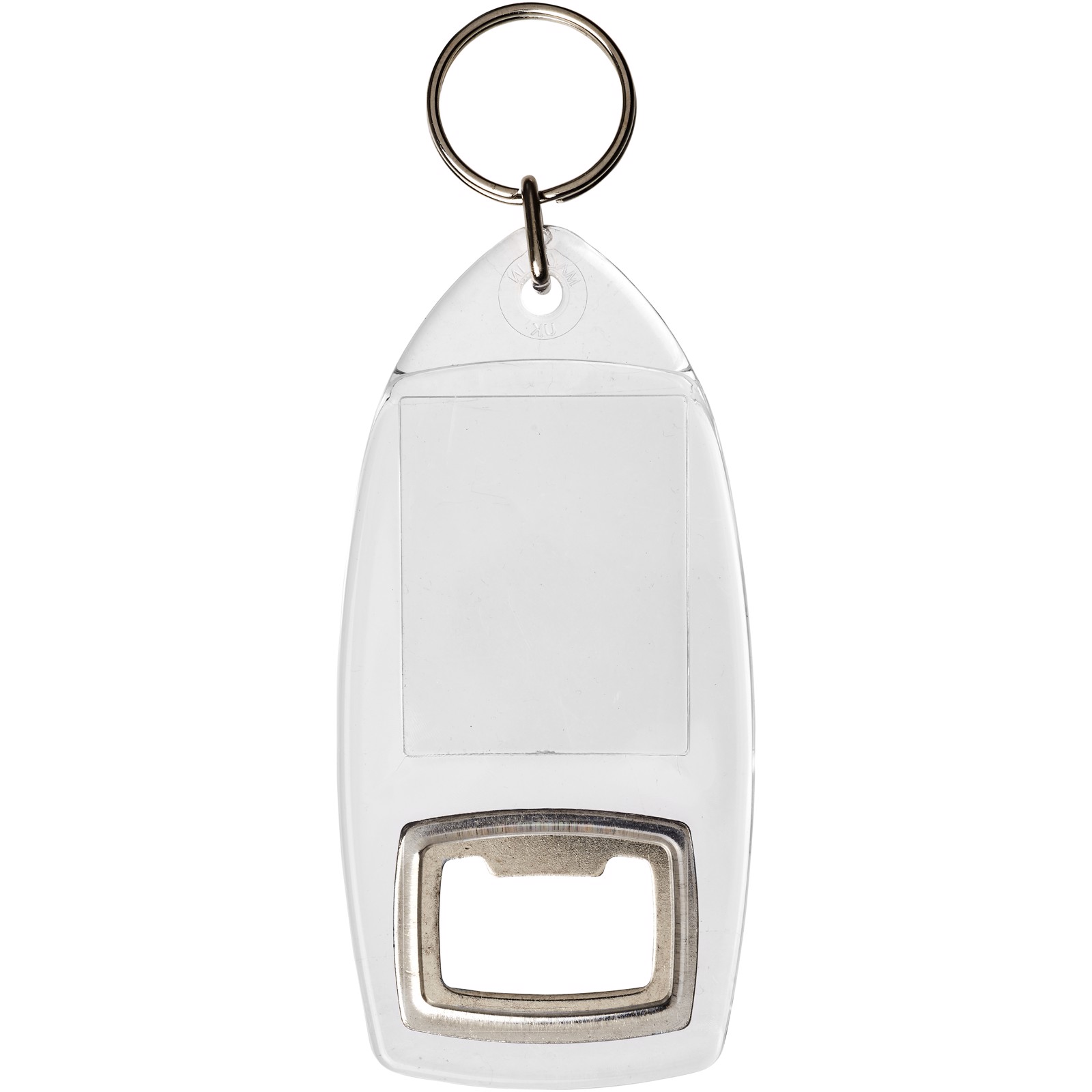 Clear R1 keychain with bottle opener and metal split keyring. The metal looped ring offers a flat profile which is ideal for mailings. Print insert dimensions: 4,0 cm x 3,2 cm.