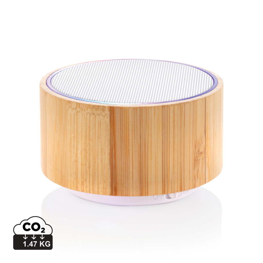 Natural bamboo 3W speaker with built-in 300 mAh lithium battery. With playing time up to 3 hours on one single charge and operating distance of 10m using BT4.1. Including integrated ambient light.