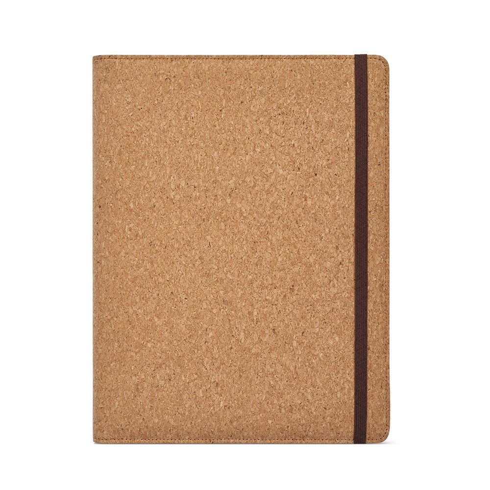 Kafka cork A4 folder with elastic closure includes a tablet sleeve (up to 29 x 18cm), 64 sheets of FSC ivory dotted paper (70gsm) with a dedicated area for date and page number and features a phone pocket (up to 10 x 18cm), 2 card slots and a pen holder. Packed inside an individual kraft box.