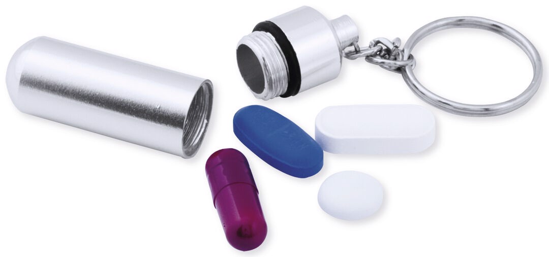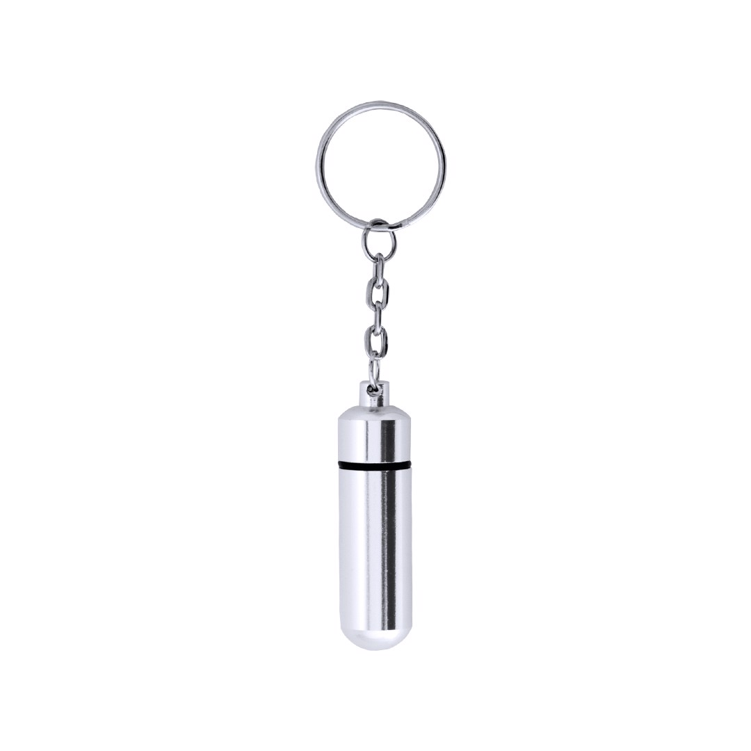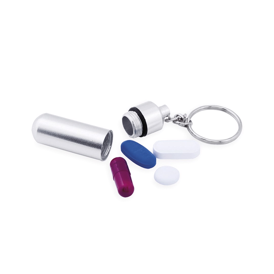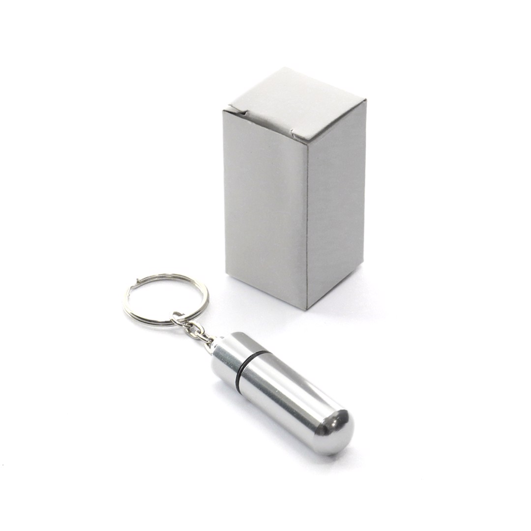 Discreetly designed pill case keychain with aluminum body, in glossy finish and with screw-on lock. 1 Compartment
