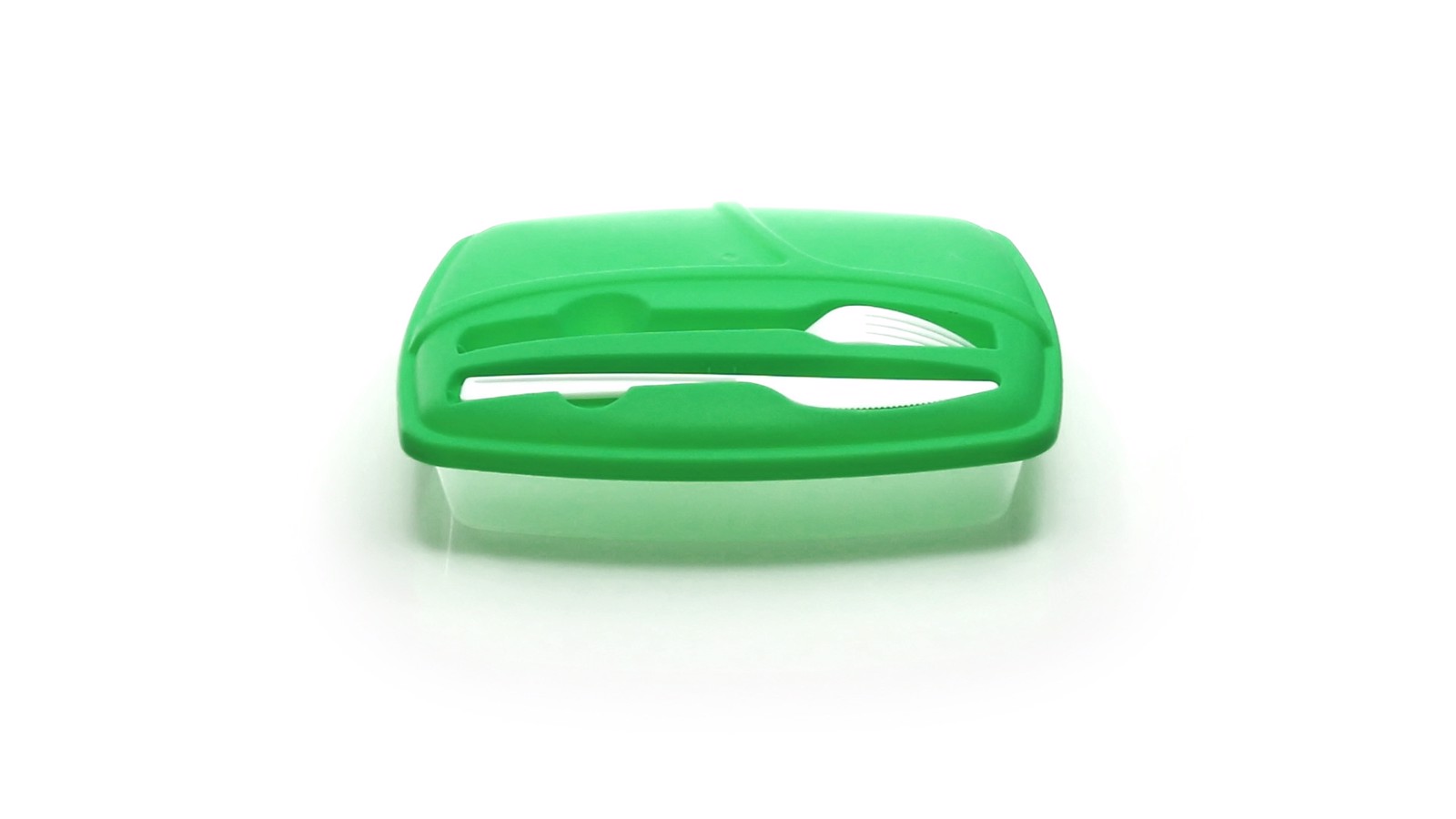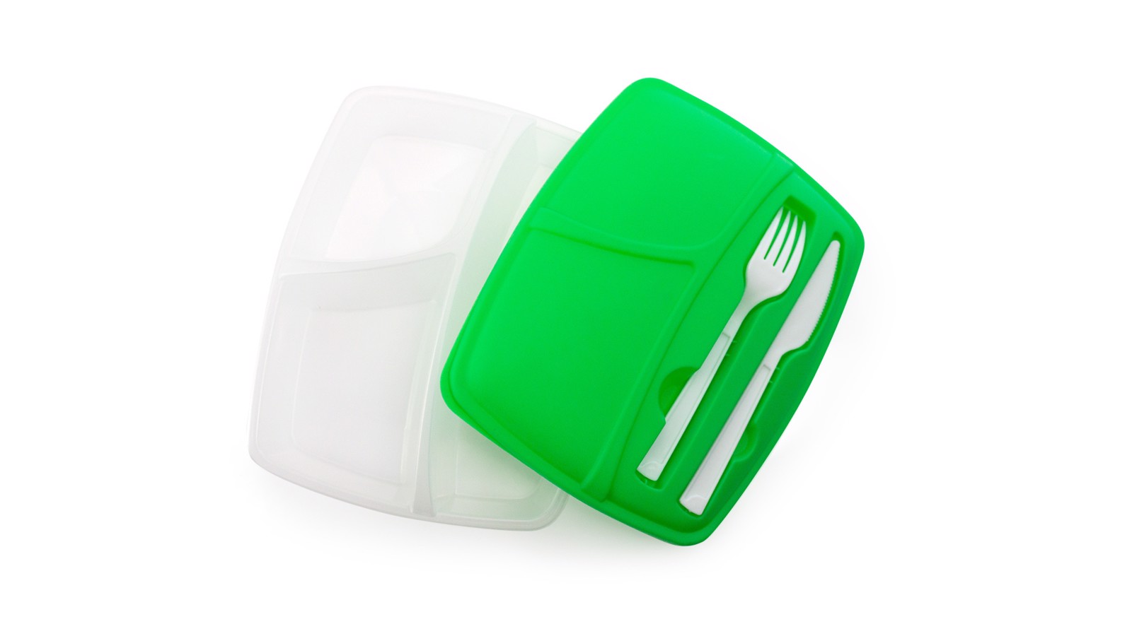 800ml capacity lunch box in PP material. With translucent body, inside with two compartments and cutlery holder cover -including knife and fork- in a wide range of tones. Suitable for dishwashers. 800 ml