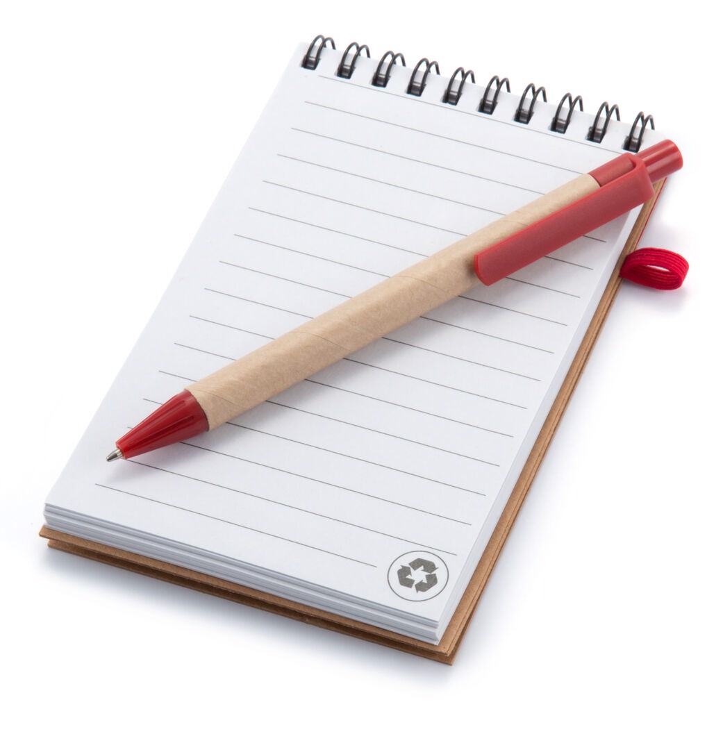 Ring notebook with soft-touch covers in resistant bicolor recycled cardboard. With elastic fastening on the cover and recycled cardboard ball pen in matching color. 70 sheets with striped, ecological layout and ball pen holder on the back cover. Hard Cover. 70 Sheets. Recycled Cardboard Pen Included