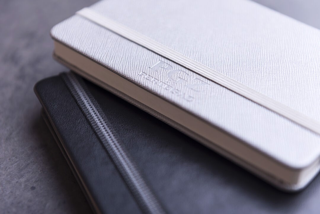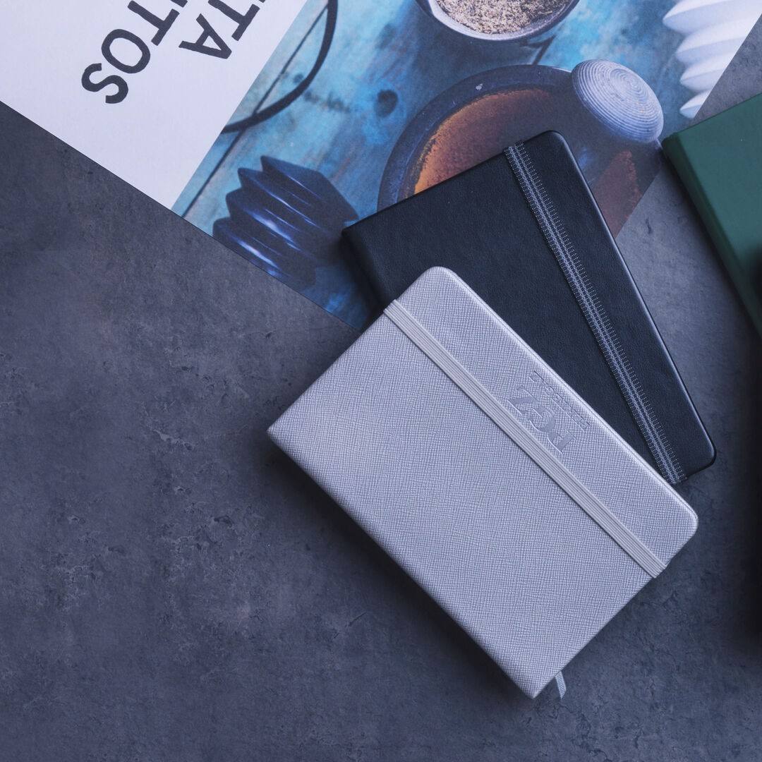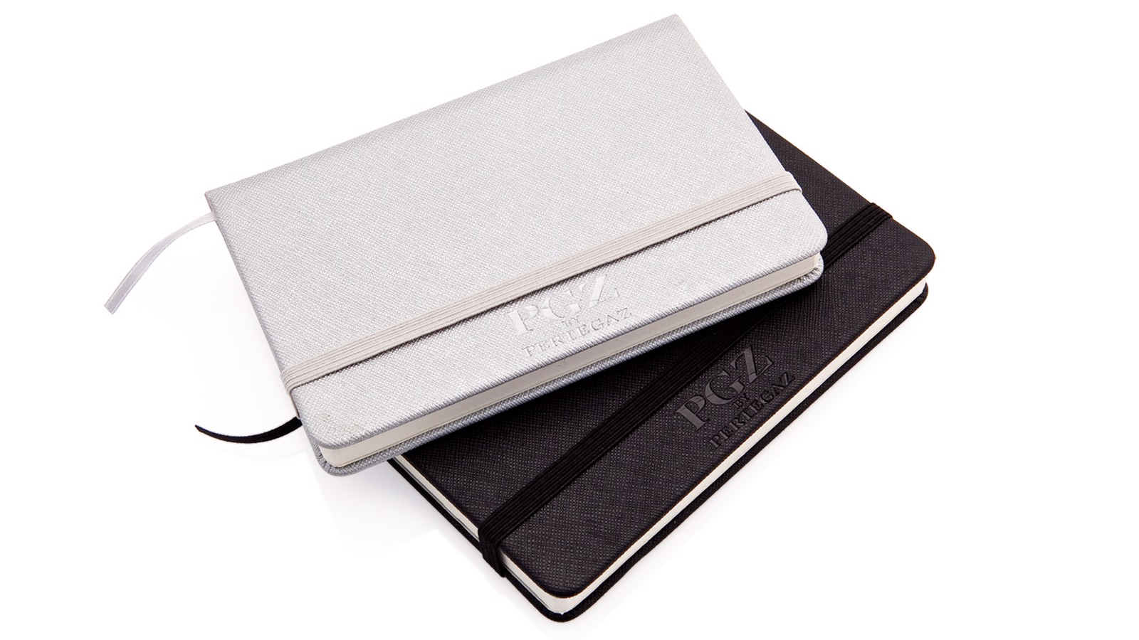 Notepad by Pertegaz with soft-touch covers and elegant PU leather finish. 80 blank sheets, with elastic band and matching color fabric bookmark. Brand logo engraved on cover. Hard Cover. 80 Sheets