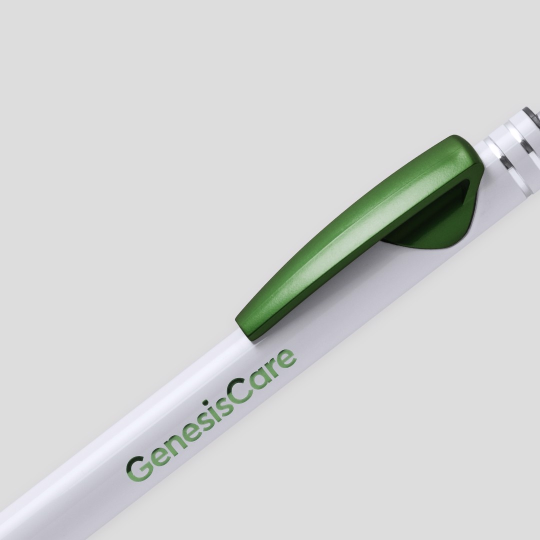 Ball pen with push-up mechanism, aluminum body in white solid color and upper ring in a wide range of bright, metallic colors. Clip with a wide printing area. Especially designed for laser engraving, including a special coating for your logo to be properly engraved in matching color with the clip. Blue ink.