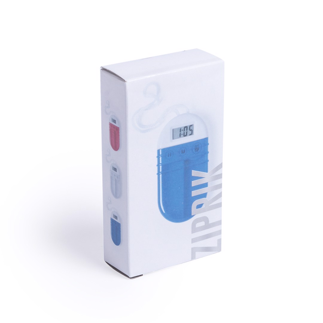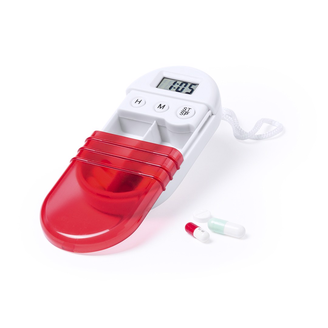 Pill box with timer in soft and resistant material in white, with transparent coverin bright tones. Two inside compartments for pads and adjustable digital timer. Button cells included and presented in an attractive design box. 2 Compartments. Button Battery Included
