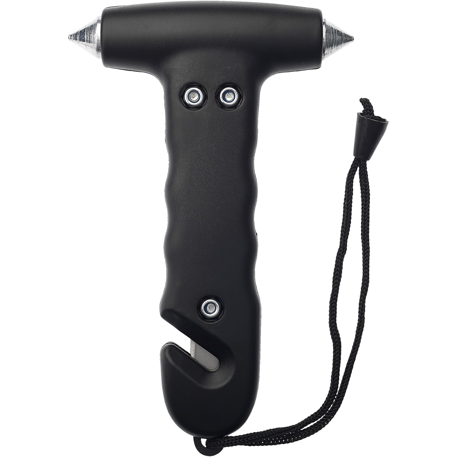 Emergency hammer with wrist strap and built-in belt cutter in the handle. Two pointed hardened steel window breakers and belt-cutter can be used to escape in case of an unfortunate situation.