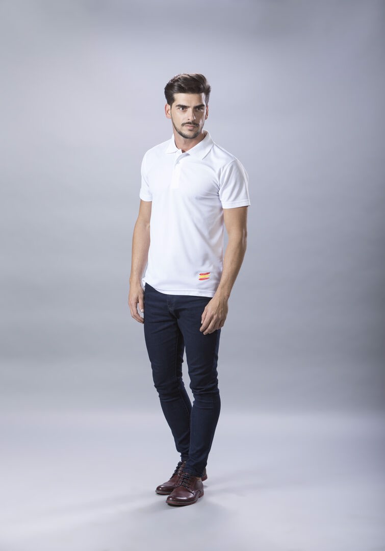 Technical polo shirt for adult in 100% breathable polyester material of 180g/m2. With two matching color buttons and national flag accessories in waist and sleeve. Available in sober colors and in sizes S, M, L, XL. Breathable. Sizes: S, M, L, XL
