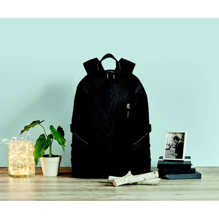 15 laptop backpack in 600D with rip stop details. Includes one internal 15 laptop compartment, one main front zippered pocket and 2 side compartments. Adjustable shoulder strap.