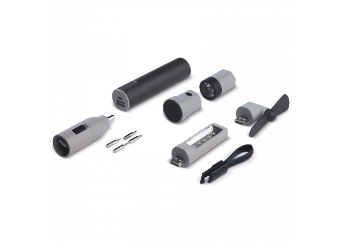 This special Toppoint design multi-tool powerbank (2200mAh) is not only suitable for charging a phone, but also includes different plug-on parts. COB LED light where different LED lights are combined into a bright light, with screwdriver bits, fan, flashlight and speaker. The set will be delivered in an EVA-pouch.