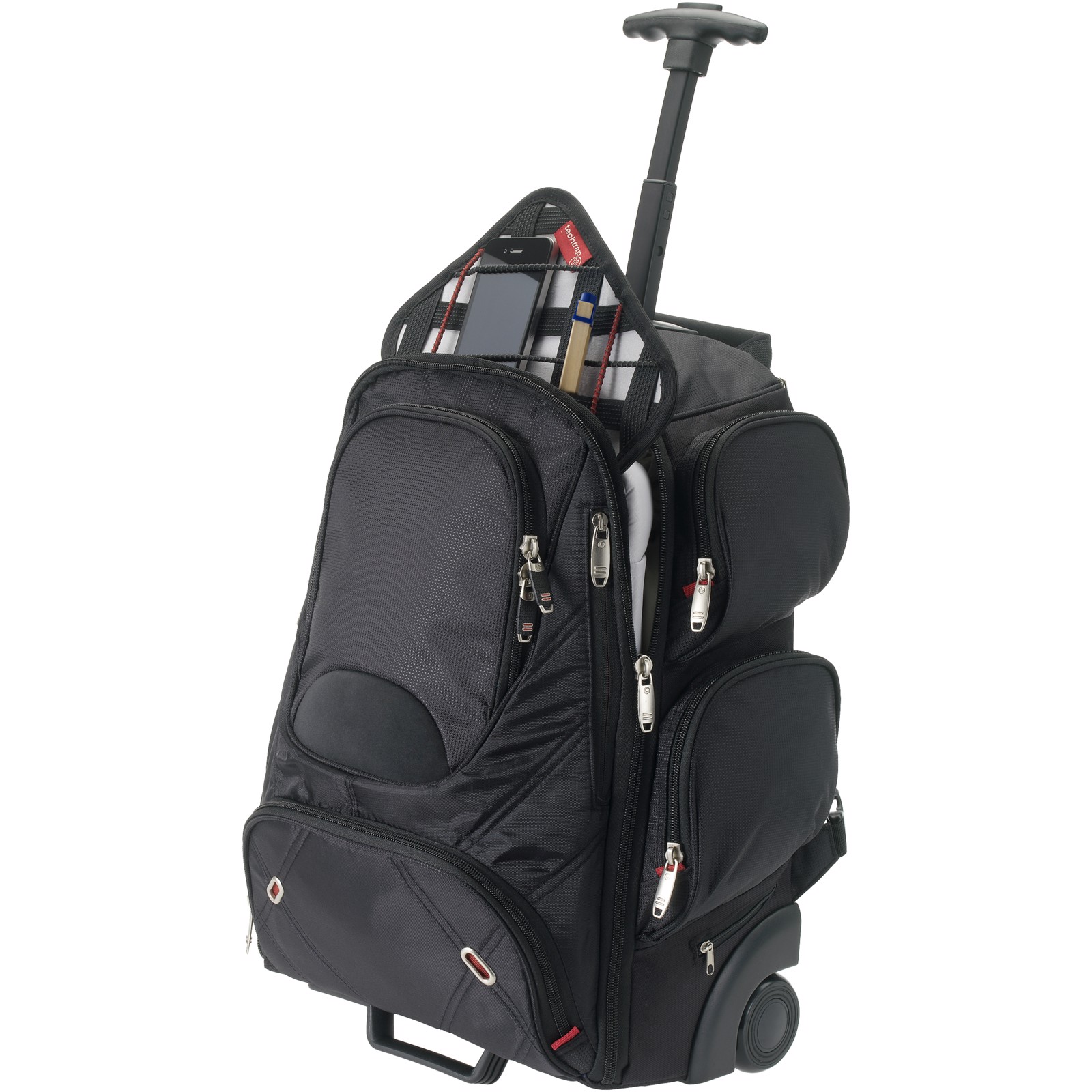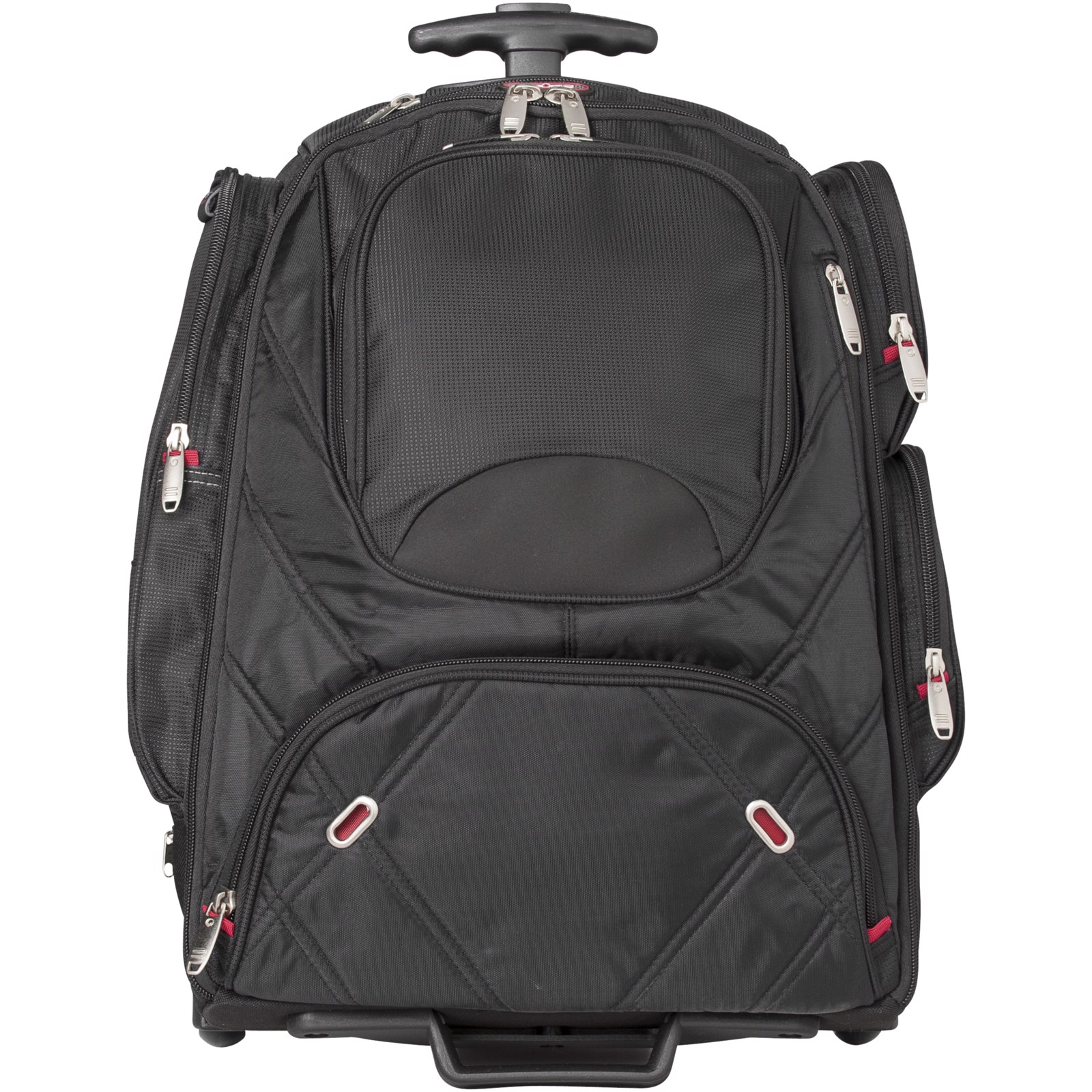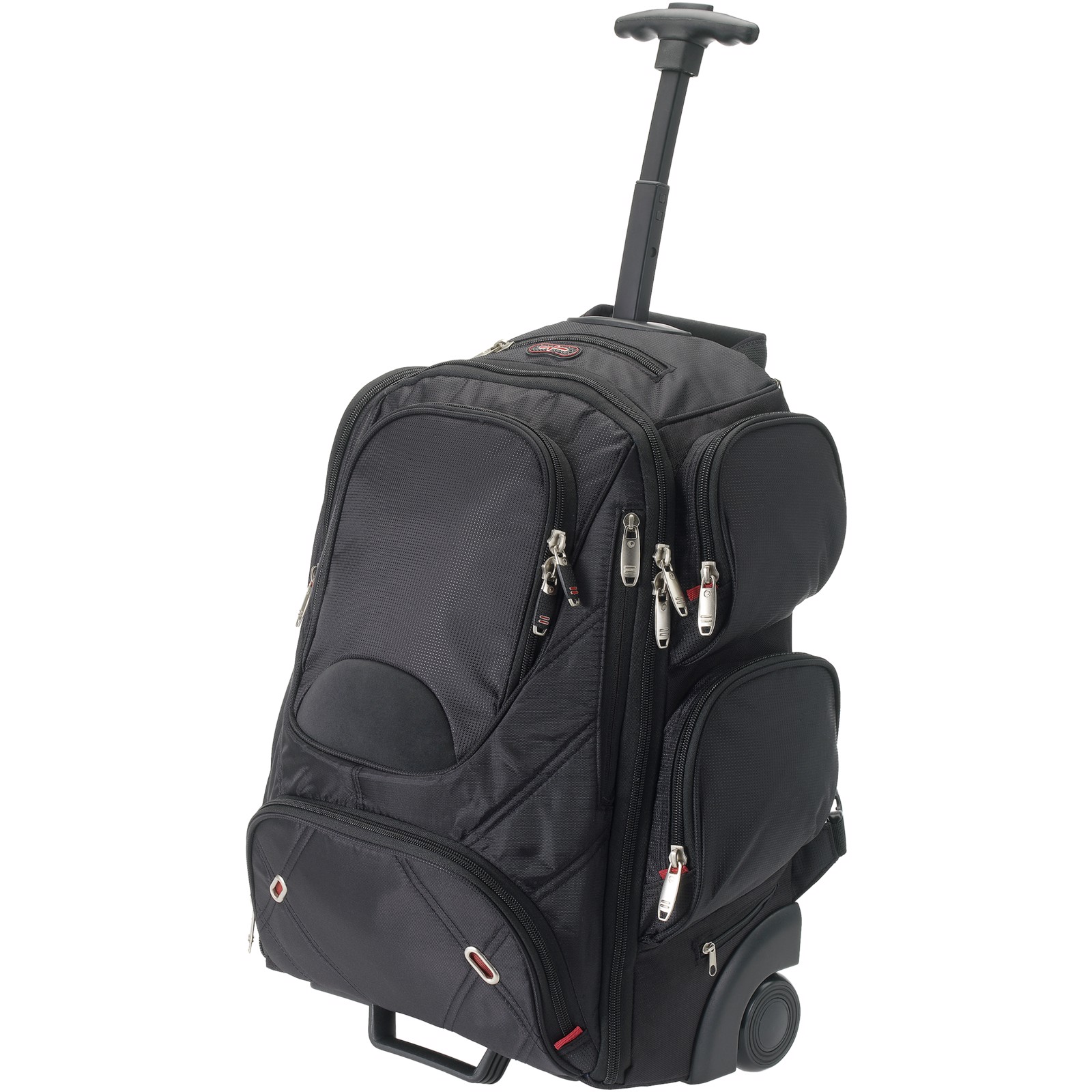 Cabin approved trolley, main zippered compartment includes TSA-friendly laptop compartment expediting airport security. Holds most 17" laptops. File dividers and ear bud port access. Zippered media pocket. Front zippered pocket. Hideaway backpack straps and comfort carry handle. Exclusive design.