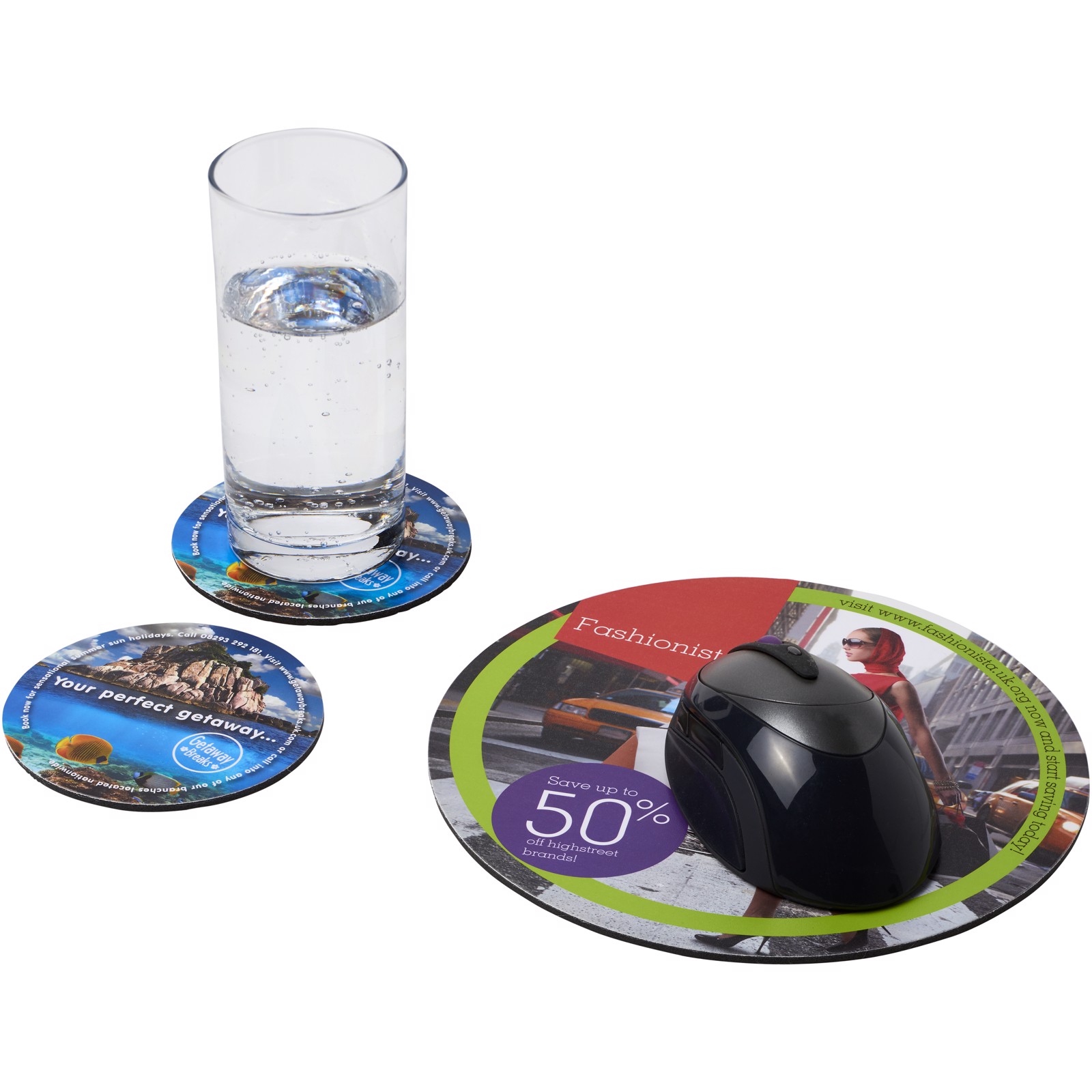 Features a Q-Mat mouse mat and a set of two matching coasters branded with your company design. The set comprises of a round mousemat (0.3 x ø20 cm), and two round coasters (0.3 x ø9.8 cm).