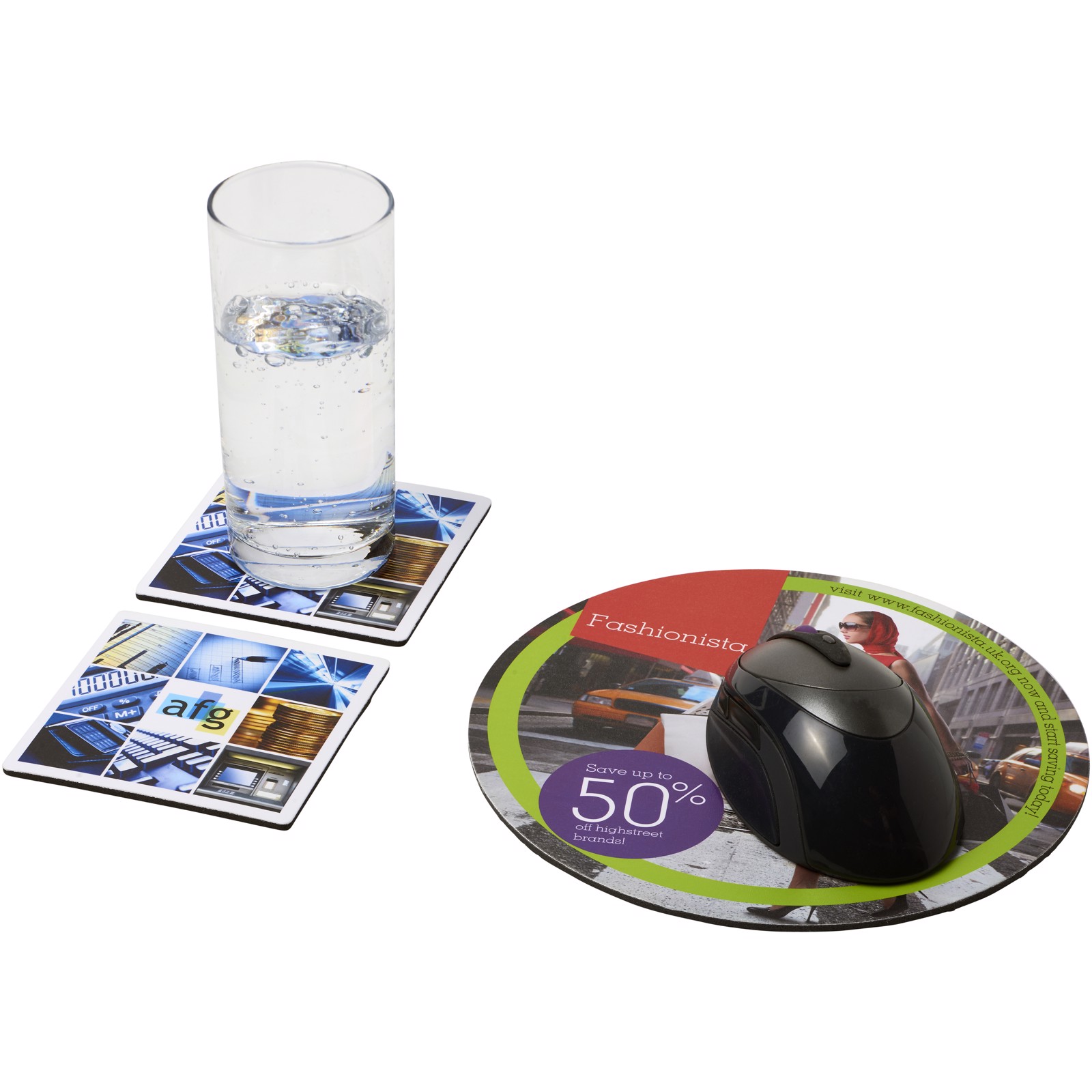 Features a Q-Mat mouse mat and a set of two matching coasters branded with your company design. The set comprises of a round mousemat (0.3 x ø20 cm) and two square coasters (0.3 x 9.8 x 9.8 cm).