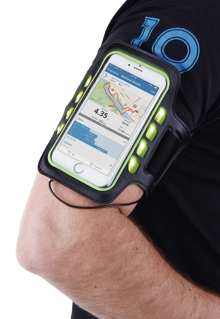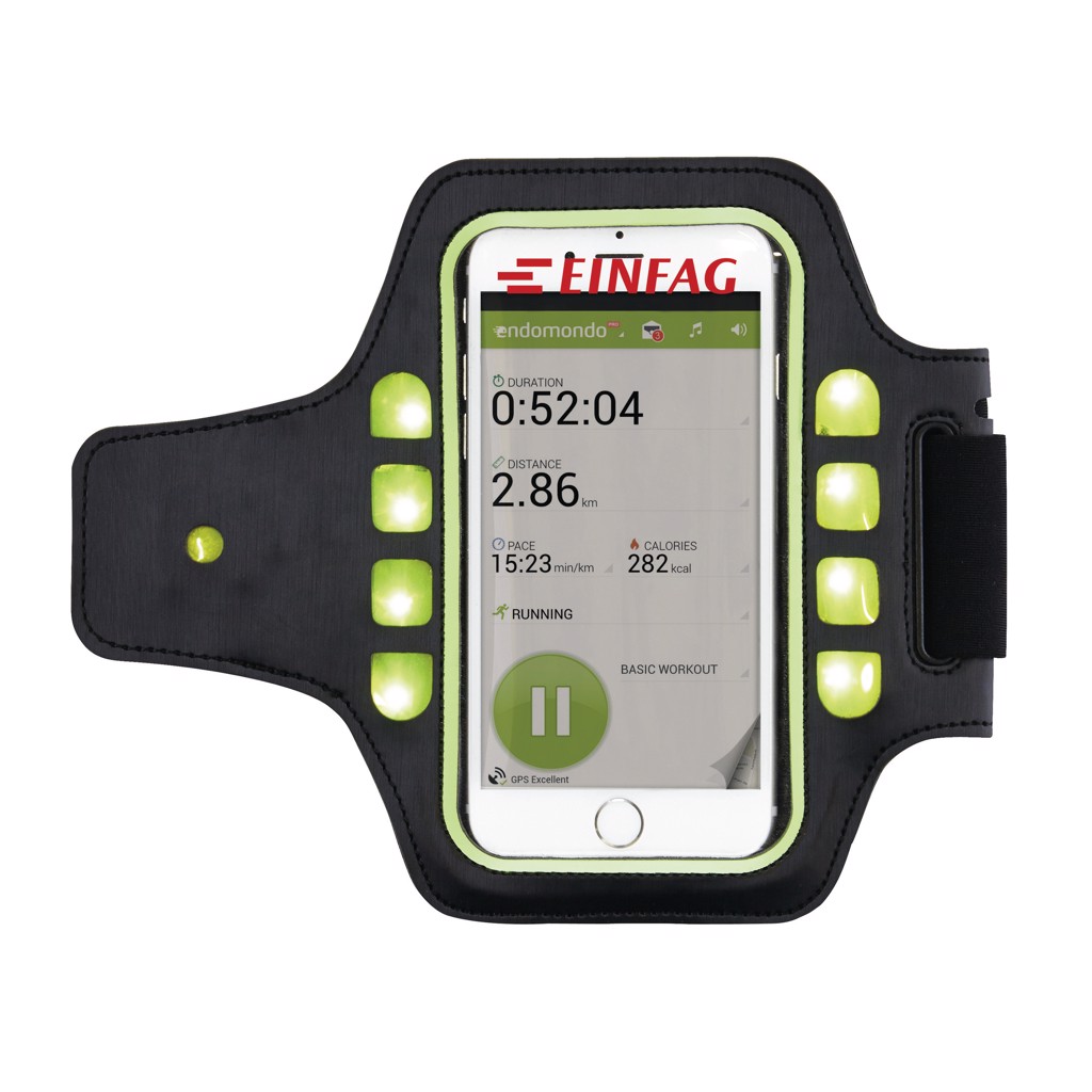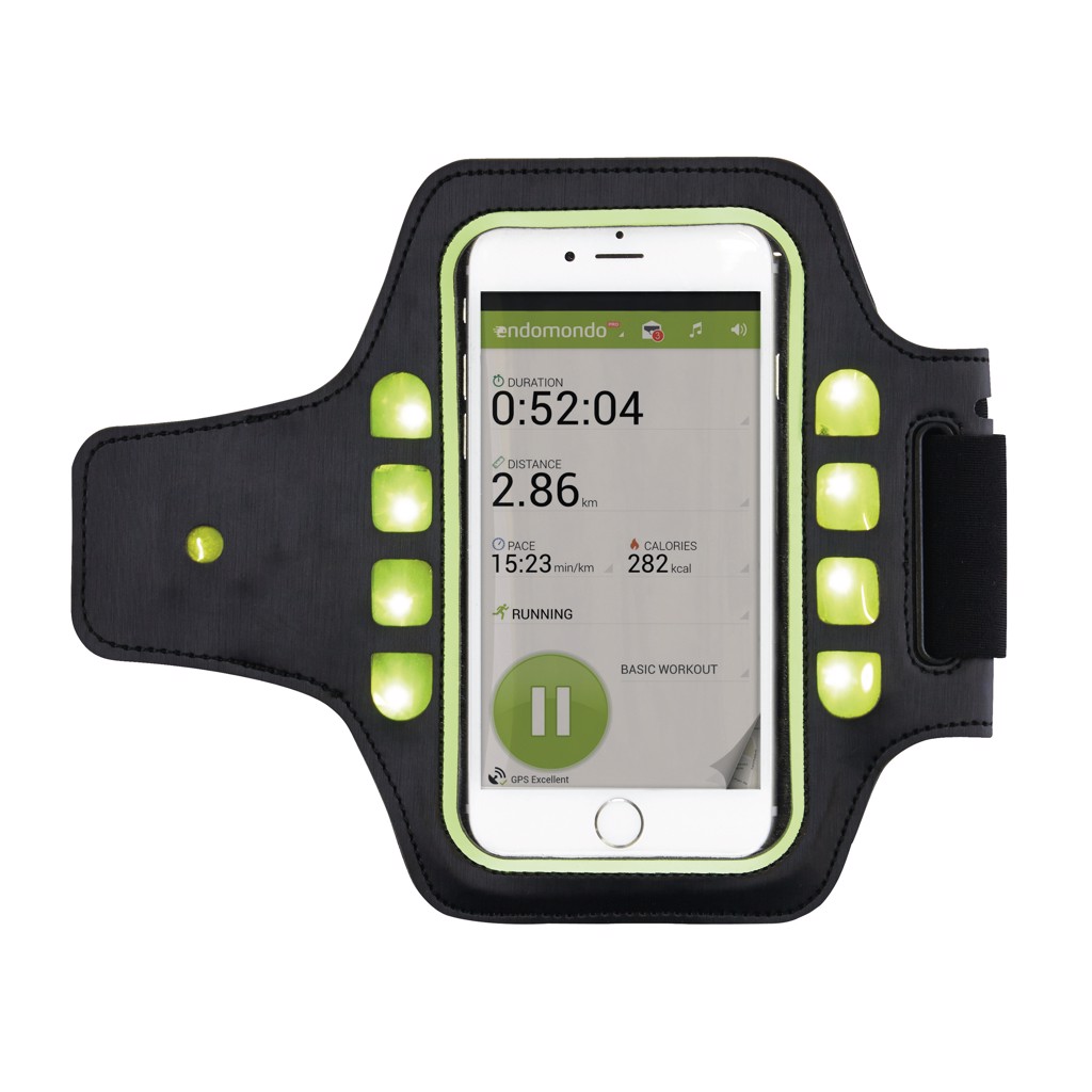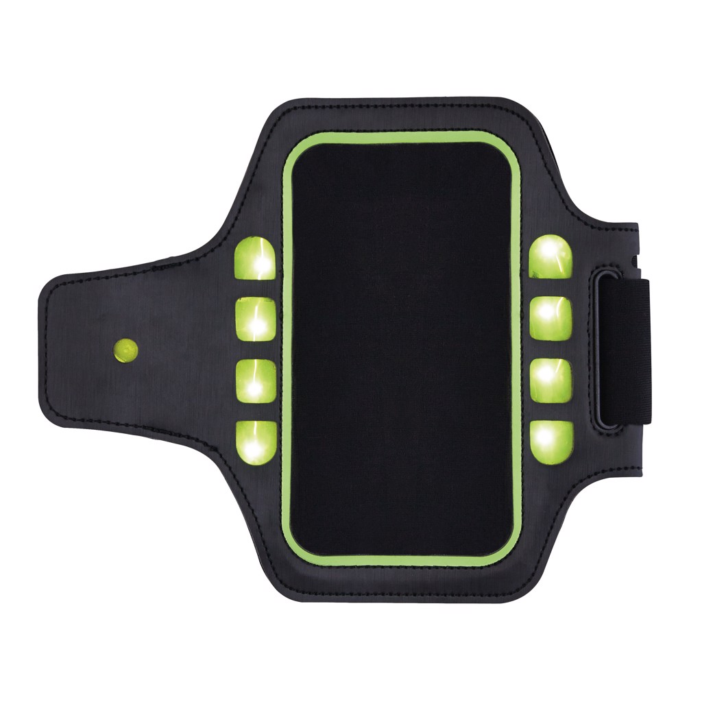 Exercise safely in the dark with this neoprene universal armband with built-in LED light and velcro strap. Fits all common phones for example: iPhone 5, iPhone 6, Samsung Galaxy 5 and HTC one. With key holder pocket.